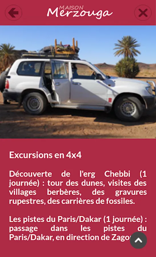 At the level of the activities, you have the choice between excursions with back of camel (Go to see the rising or the sunset on the dunes, Spend a night in the desert: bivouac in Berber tent in the middle of the dunes.), Excursions in 4x4 (Discover Erg Chebbi, tour dunes, visit Berber villages, rock carvings, fossil quarries), and visit the Berber village, the palm grove with irrigation systems, bread ovens, initiation to Berber cuisine and languages, as well as downhill dunes skiing.