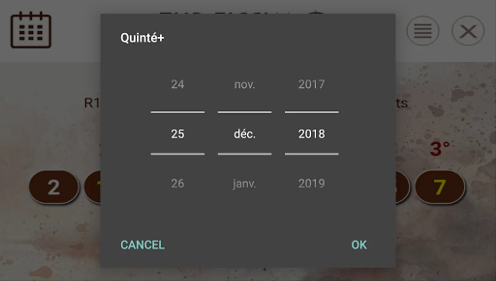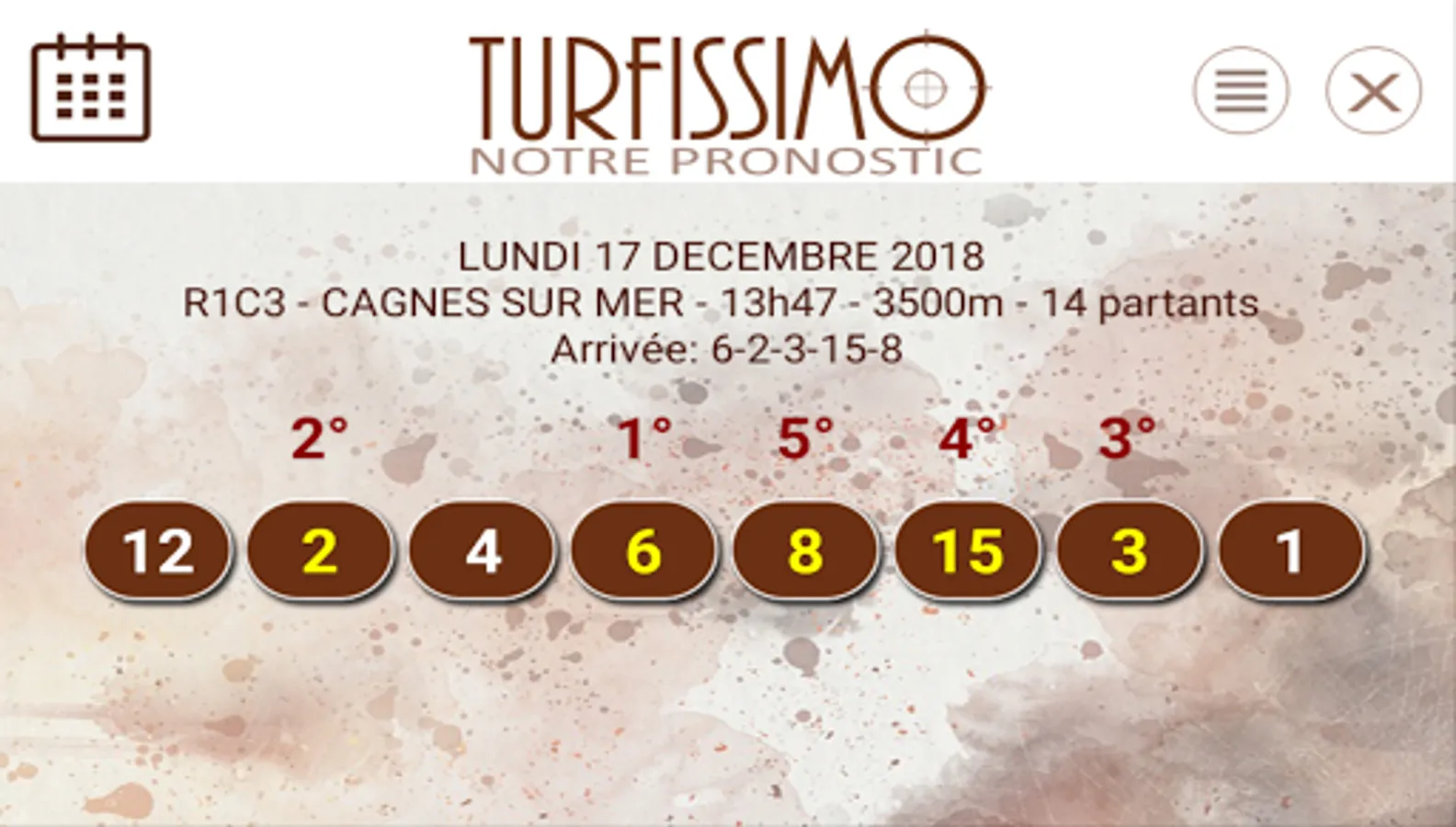 The prognosis is available the day before the Quinté to play. A Calendar on the application allows you to focus on the day of your choice, and thus observe the results of the prognosis for past quintés.