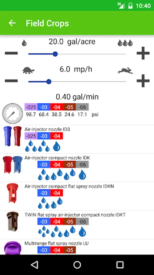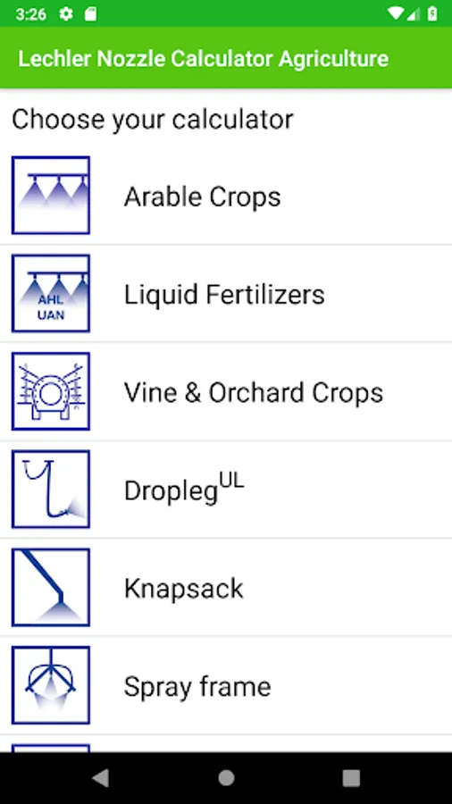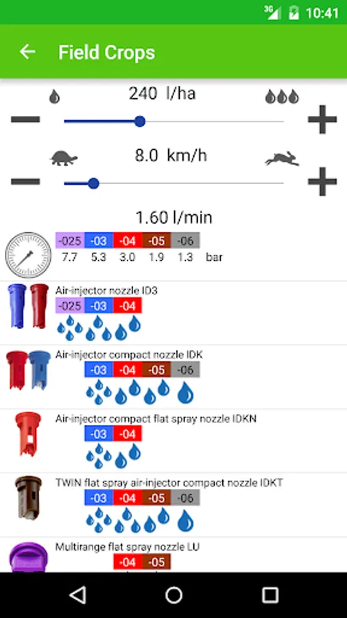 The Lechler App offers you an easy selection of the correct nozzle for your application. Just enter speed and spray rate and as a result you will receive the selection of appropriate Lechler nozzles with droplet size categories.
