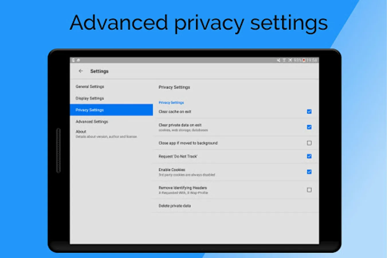 - Cookies and Web Storage are deleted when closing the app (cache too, if desired)