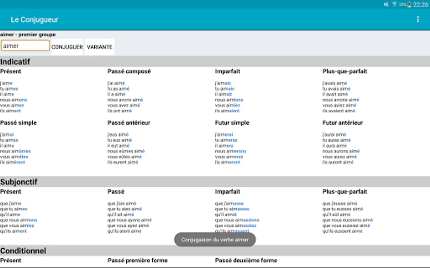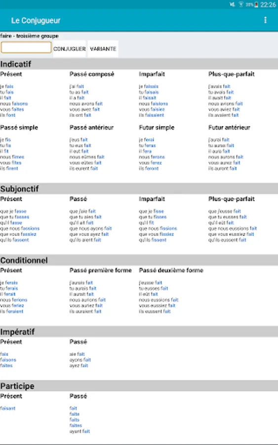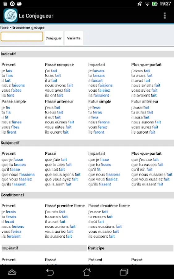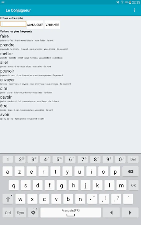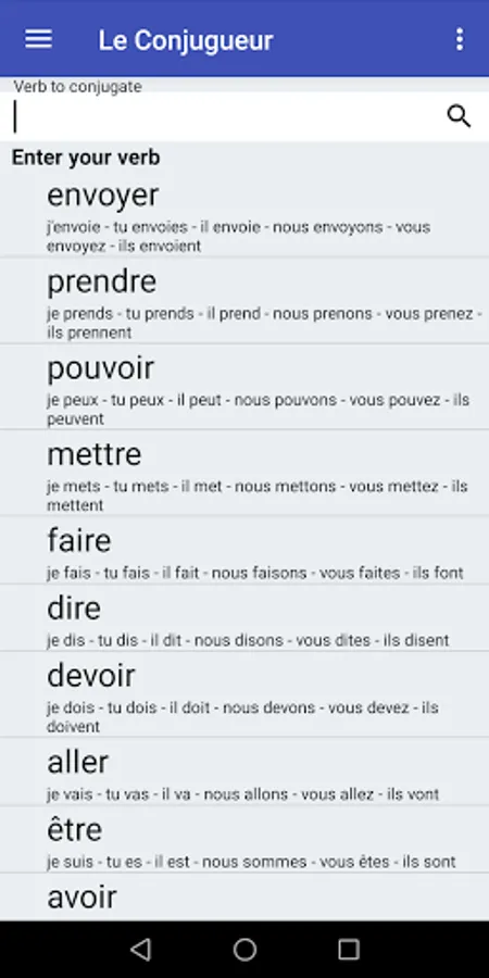 With Le Conjugueur, you can conjugate all French verbs. It contains the conjugation for nearly 9000 verbs. All the verbs are included and you don't need to be connected to use it.