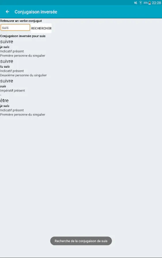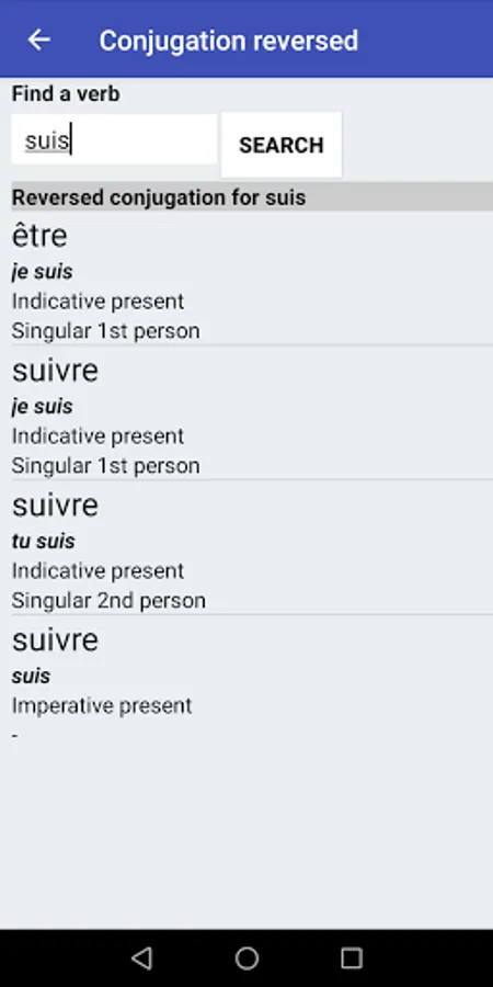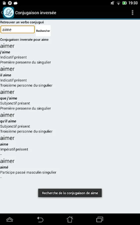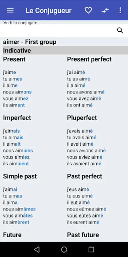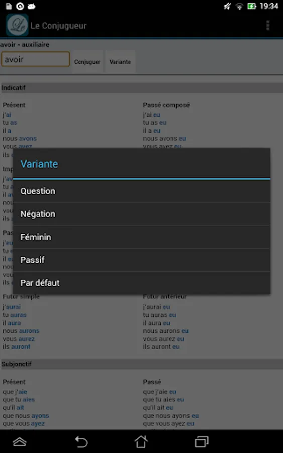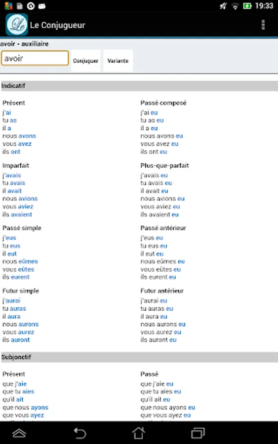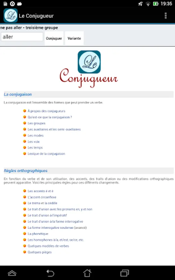 With Le Conjugueur, you can conjugate all French verbs. It contains the conjugation for nearly 9000 verbs. All the verbs are included and you don't need to be connected to use it.