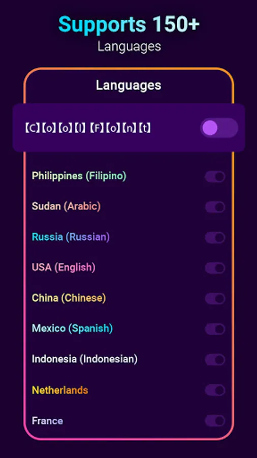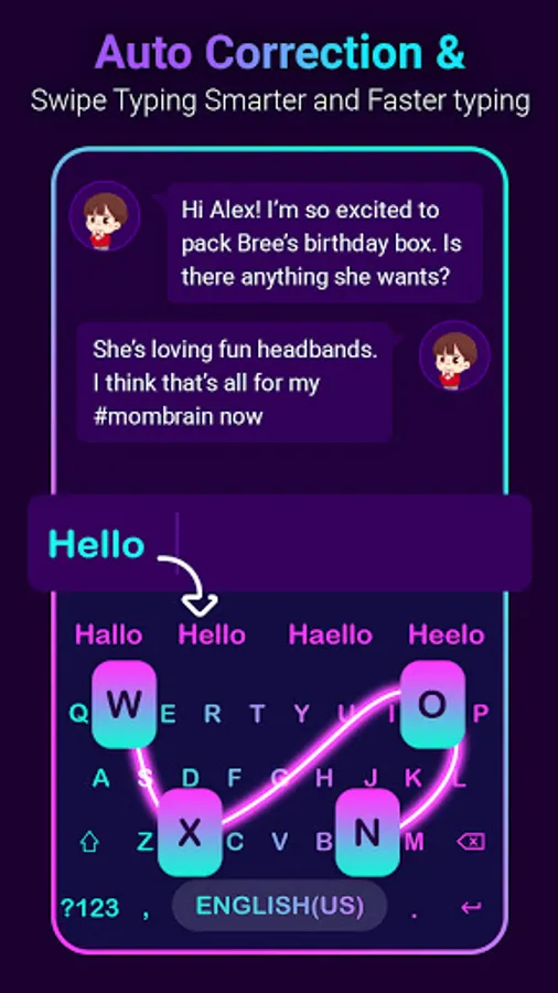 Use Neon led keyboard in your language with multi-language support for example hindi keyboard. Add your language to type in your local language using the neon keyboard themes. Neon keyboard is designed in different beautiful RGB Keyboard themes.