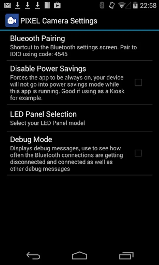 This app allows you to stream and record video from your Android camera to the PIXEL: LED ART display.