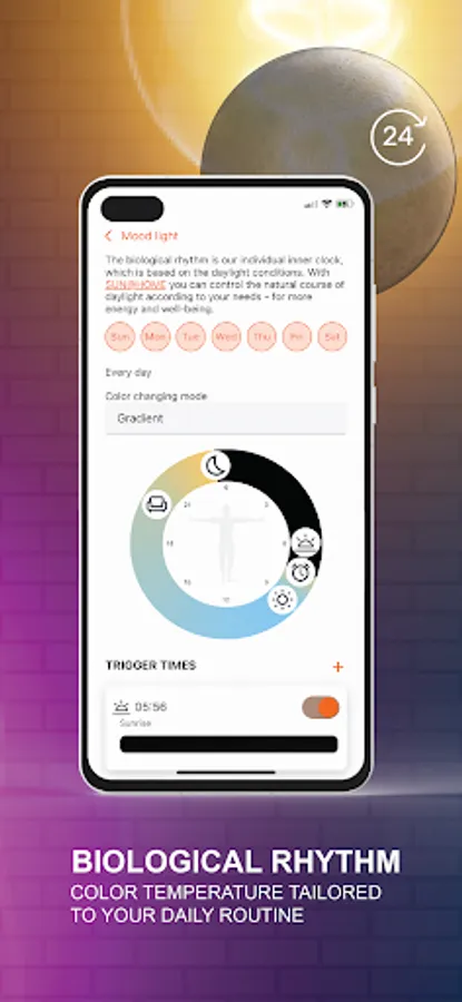 It doesn't matter whether you wake up in the morning or go to bed in the evening - with some of the LEDVANCE products, light alarm clock settings with fade-in or fade-out lighting can be easily defined using an app. Matching lighting to circadian rhythms Light similar to that found in natural daylight can help improve physical well-being. Based on this scientific knowledge, you can adapt the light color and brightness of certain lamps and lights to your individual daily routine - for more peaceful sleep and a better mood.
