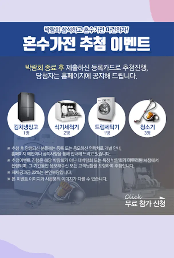 Through a lottery, we will give away a variety of essential home appliances, including one kimchi refrigerator, two dishwashers, one drum washing machine, and three vacuum cleaners.