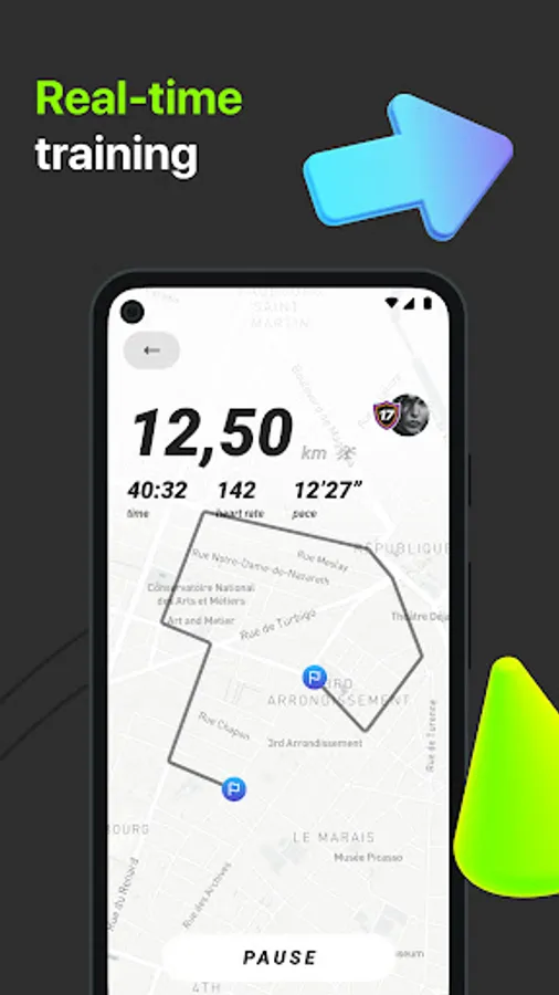 When starting the "Training" mode, data on the route, the pace of training, data on the target indicators of the distance traveled and heart rate are transmitted to the Application from a smartphone or bracelet.
