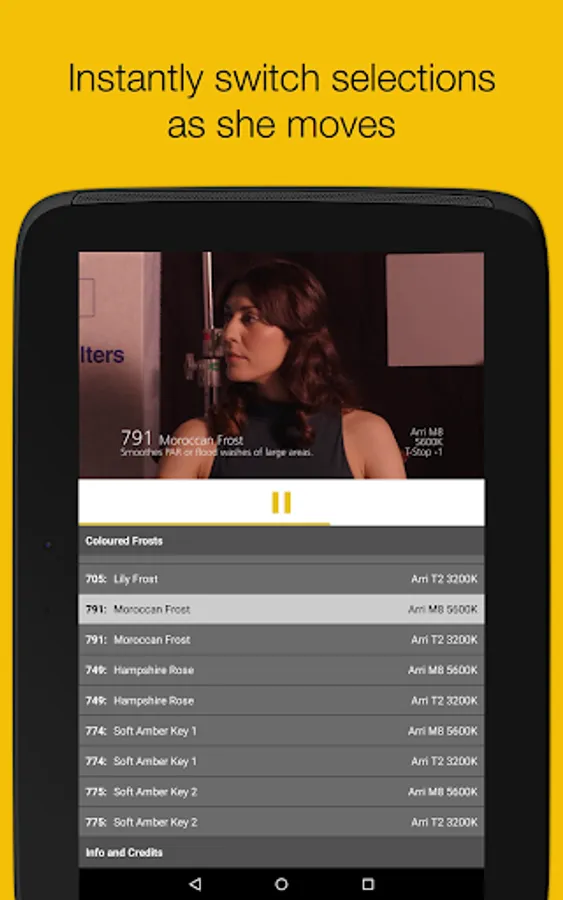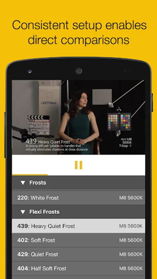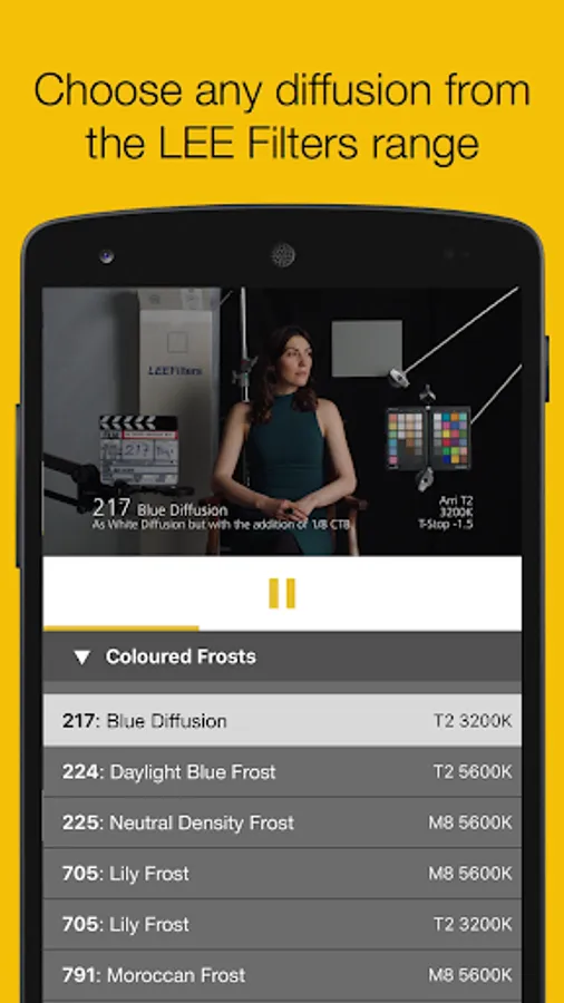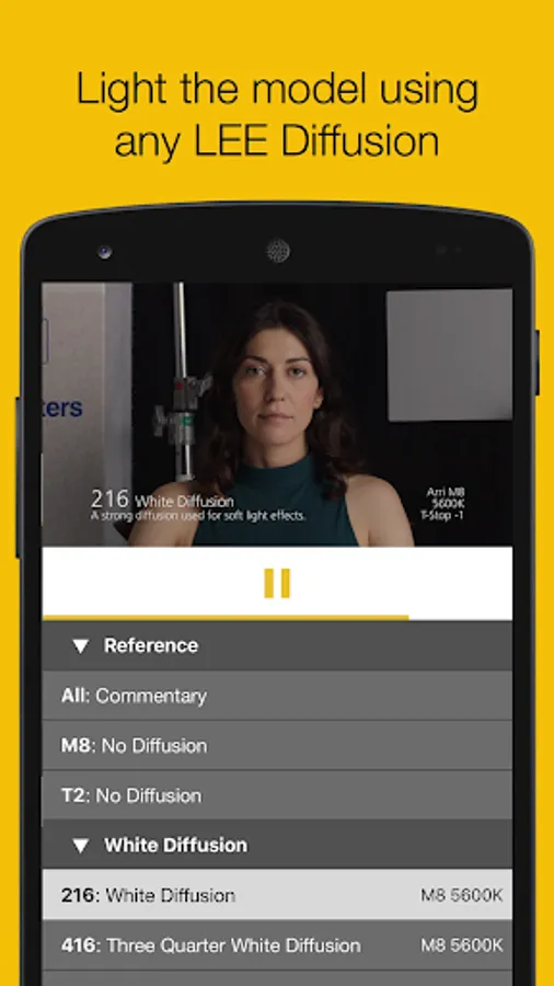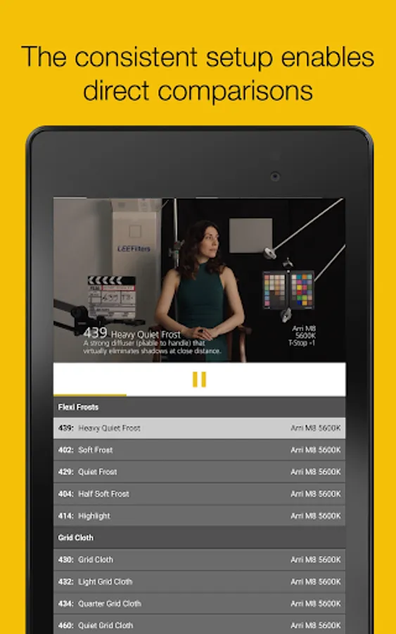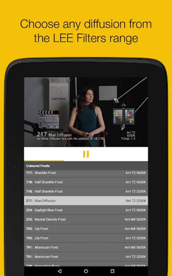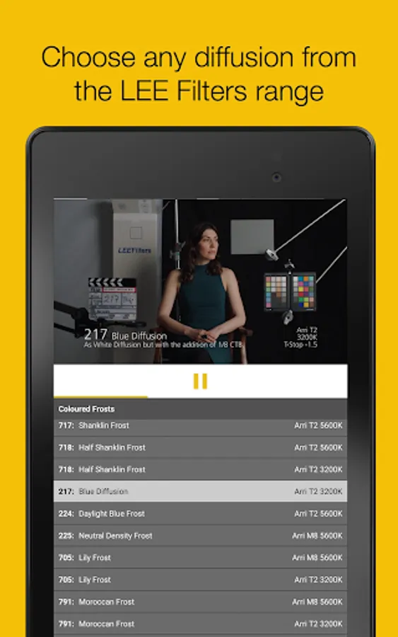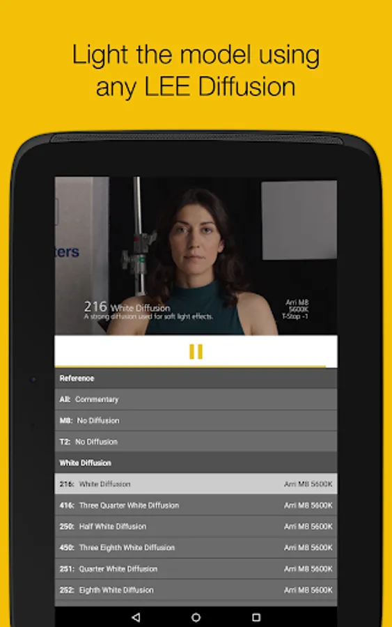 The Official LEE Filters Diffusion Comparator enables lighting designers to directly compare different diffusions lighting a model. As the video plays simply tap to switch the diffusion in real time.