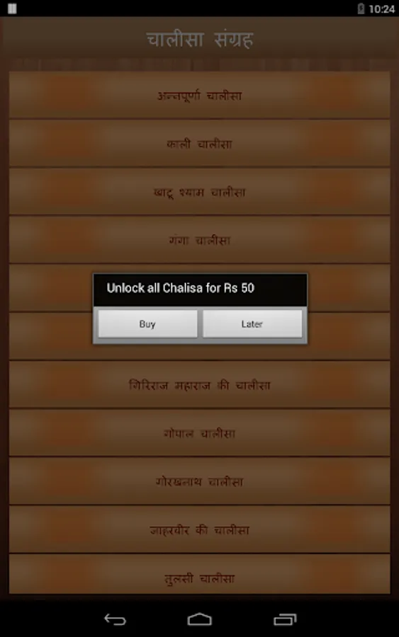 Annapurna Chalisa, Kali Chalisa, Khatu Shyam Chalisa, Ganga Chalisa, Ganesh Chalisa, Gayatri Chalisa, Giriraj Maharaj Chalisa, Gopal Chalisa, Gorakhnath Chalisa, Jahrvir Chalisa, Tulsi Chalisa, Durga Chalisa, Narmada Chalisa, Navagraha Chalisa, Parasurama Chalisa, Parvati Chalisa, Pitter Chalisa, Pretraj Chalisa, Balaji Chalisa, Brahma Chalisa, Mahakali Chalisa, Mahavir Chalisa, Ravidas Chalisa, Radha Chalisa, Ramdev Chalisa, Lakshmi Chalisa, Lalitha Chalisa, Vishwakarma Chalisa, Vishnu Chalisa, Vaishnodevi Chalisa, Shani Chalisa, Sheetla Chalisa, Shri Krishna Chalisa, Shri Ram Chalisa, Vindhyeshwari Chalisa, Shree Shiv Chalisa, Sri Saraswati Chalisa, Santoshi Chalisa, Sai Chalisa, Surya Chalisa