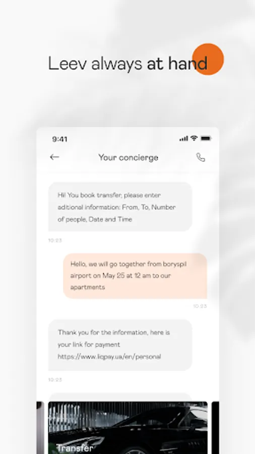 • Use the help of the chatbot leev. 24/7 support, assistance with booking accommodation/ transfer, ordering food/dry cleaning/ other services.