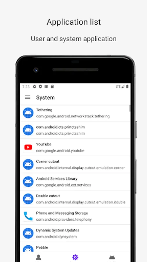 2. Support the following information viewing: apk information, app information, application package name viewing, installation date, upgrade date, occupied space, version number, installation location, application use statistics, foreground and background services, broadcast services, application permission viewing, application permission management, hardware requirements query, APK resource search, certificate signature md5, process name, UID, signature information detailed query, etc.