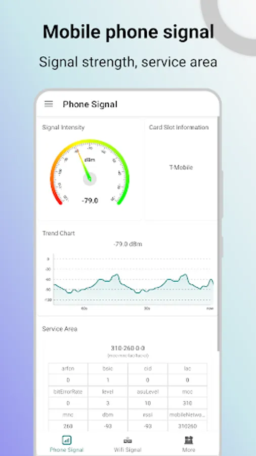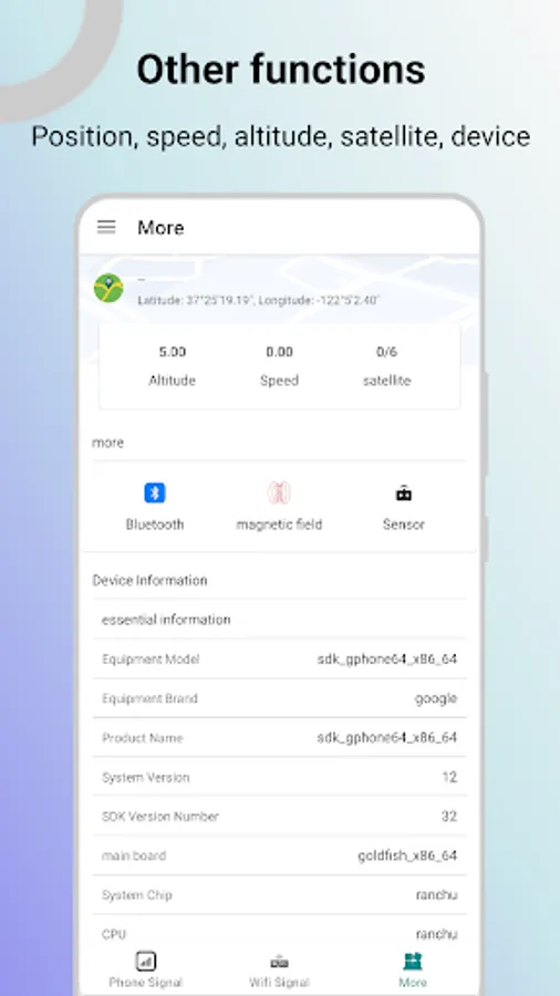 "Signal detector" is an application integrating signal detection and analysis functions of mobile phone, WIFI, Bluetooth, GPS, etc.