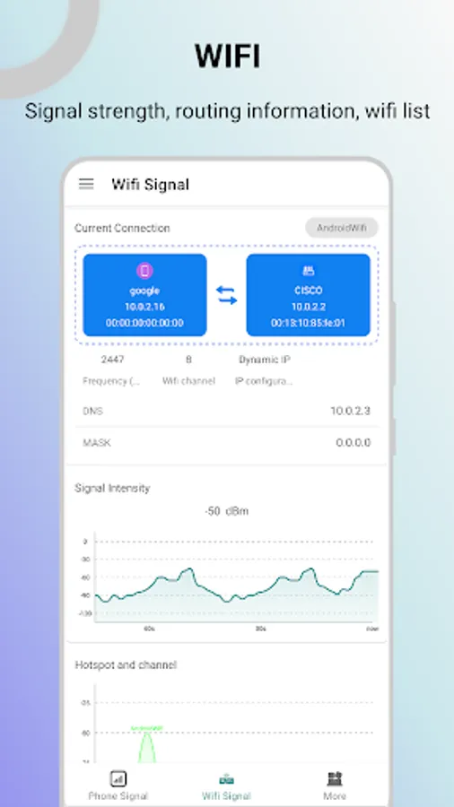2. WIFI signal: detect WIFI signal strength in real time, query WIFI information, such as signal strength, mac address, channel, IP configuration, connection rate and other related information, and obtain wifi signal and channel information;