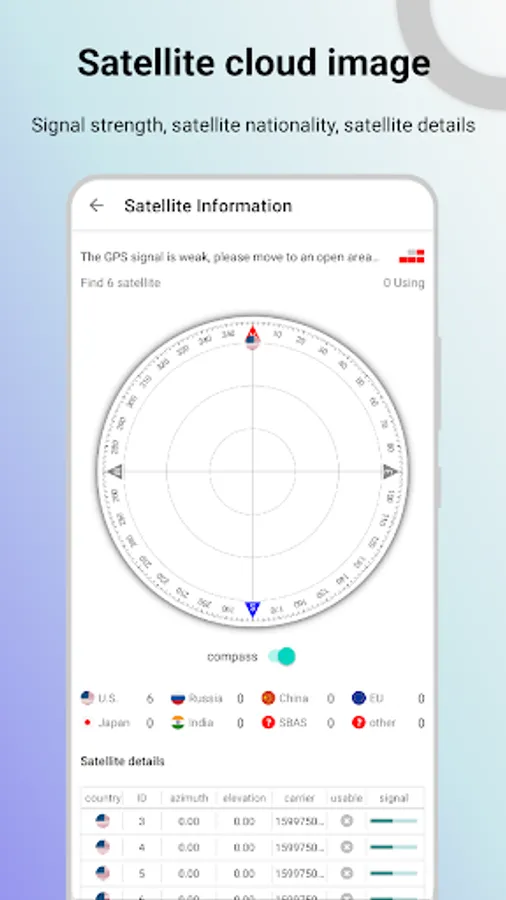 3. GPS signal: real-time detection of GPS signal information and acquisition of satellite information, including nationality name (U.S. GPS, China Beidou, European Union Galileo, Russian GLONASS, Japanese quasi zenith satellite system, Indian IRNSS, etc.), number of satellites, real-time satellite position, availability, longitude and latitude, address, etc;