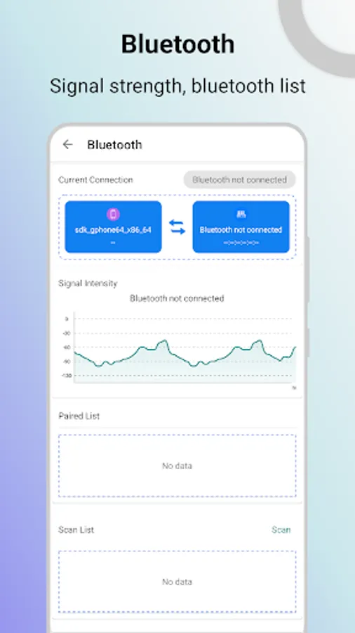 4. Bluetooth signal: real-time detection of Bluetooth signal strength to obtain the currently connected Bluetooth MAC address and other information. Query the paired list, scan to find more devices and other functions.