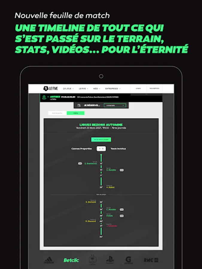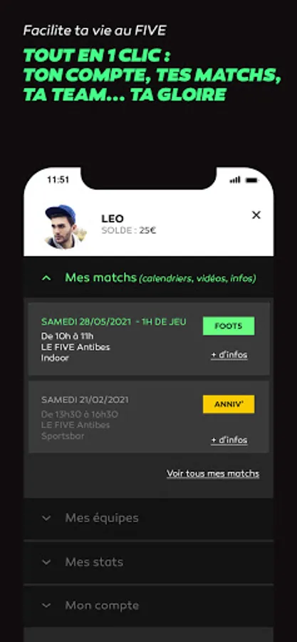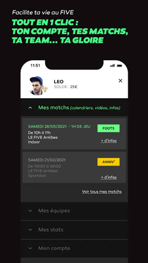 - Easier access to your matches, your videos, your stats: the player profile has been revised, you can now easily access your past or future experiences at FIVE. By clicking on your profile, bottom right on mobile or top right on computer, you can easily find your next match, your last match, your teams, and all the information relating to your sporting experience.