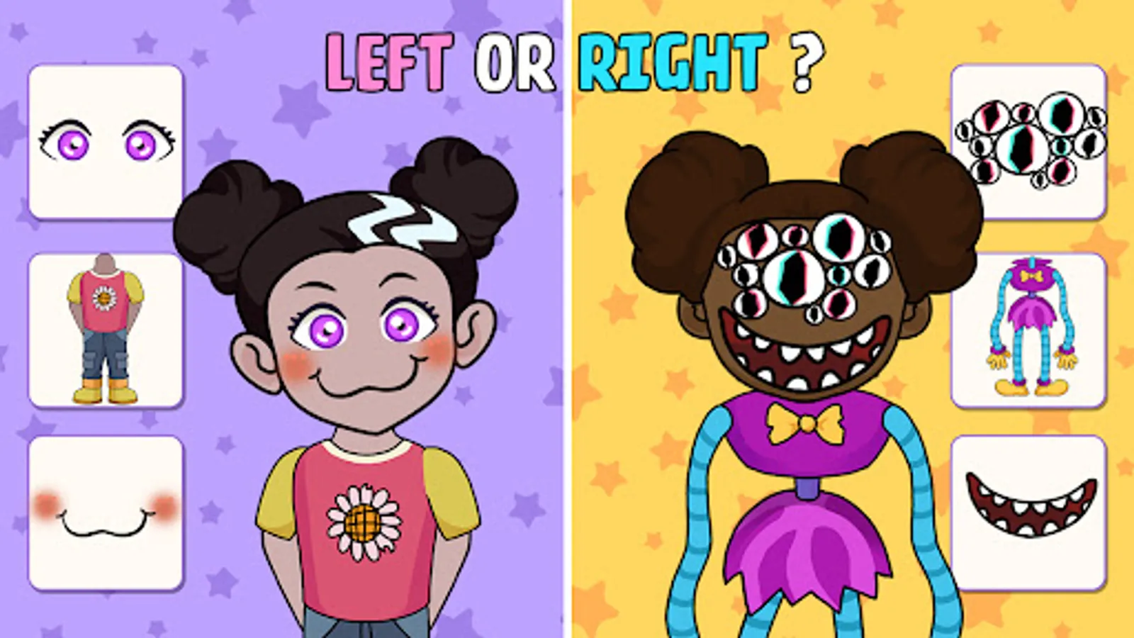 🎮How to play: The rule is very simple just like the name - Left or Right. Each round, you'll be given two choices of monster parts: left or right like monster makeover game. This choice decides the part of the monster you'll be adding to your monster. Will you choose the left option and add a set of fearsome claws, or will you go for the right option and select a pair of mesmerizing wings? Your choice not only shapes your monster's appearance but also defines its unique personality. The power is in your hands to make your own monster truly extraordinary!