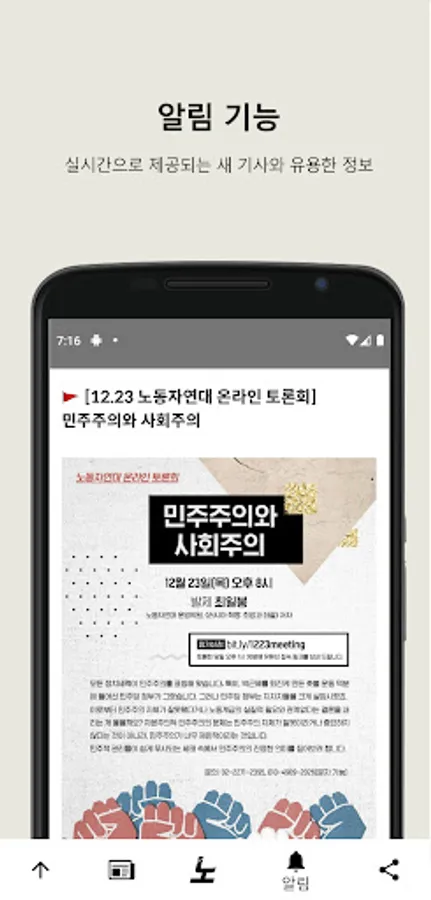 You'll find useful information, including all articles and discussion forums, which 〈Workers Solidarity〉 provides in print and online. You can quickly receive new articles and view them in a list of notifications.
