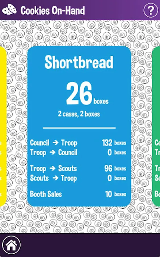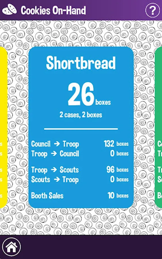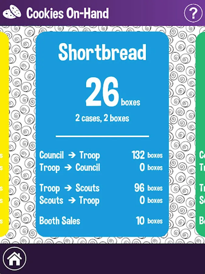 --Quick view screens show, by cookie type, how many boxes the troop has received, where they went, and how many boxes are on-hand.