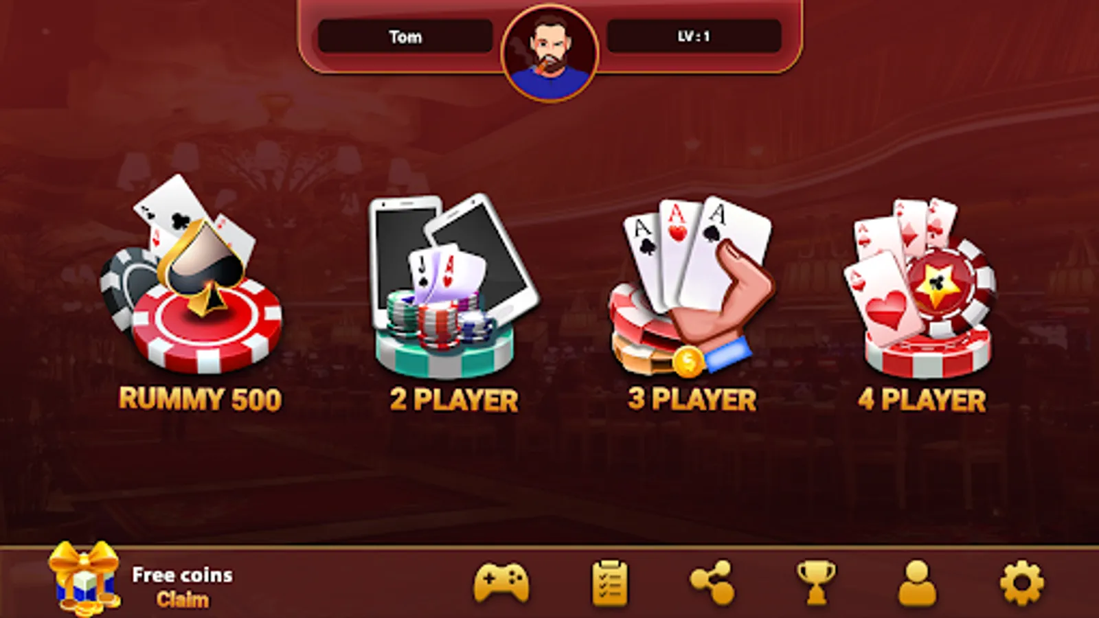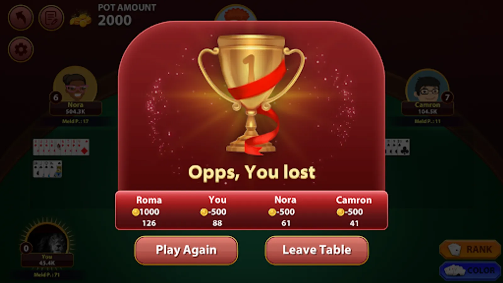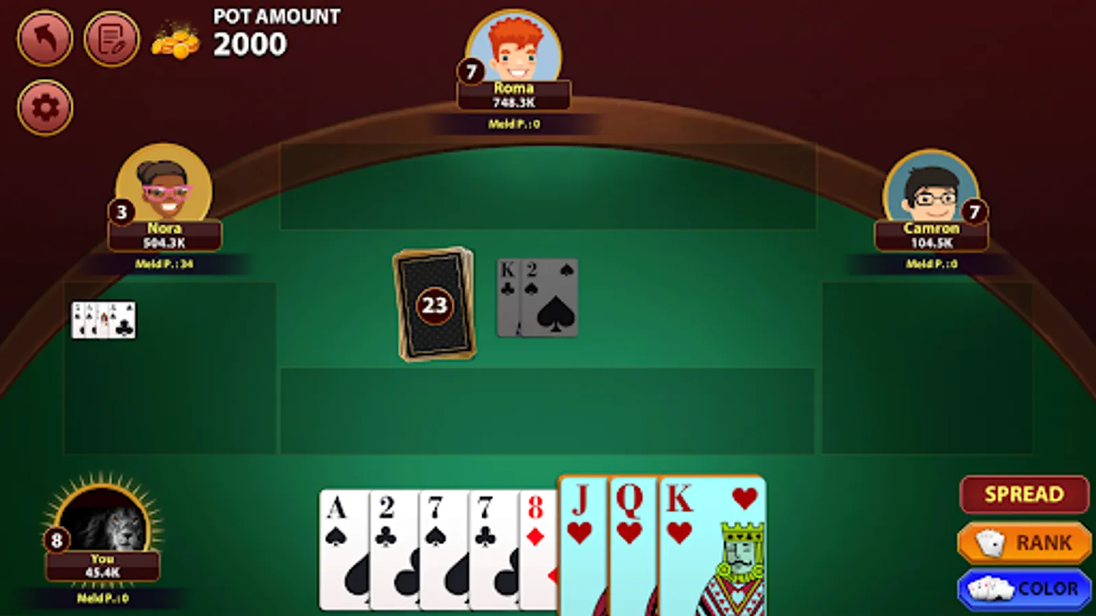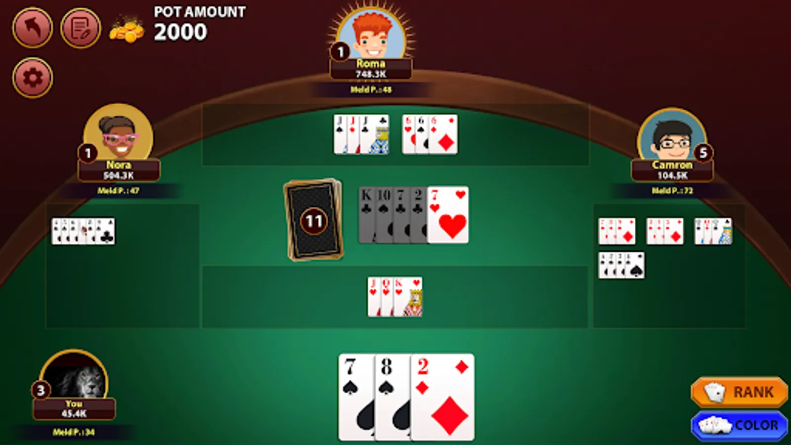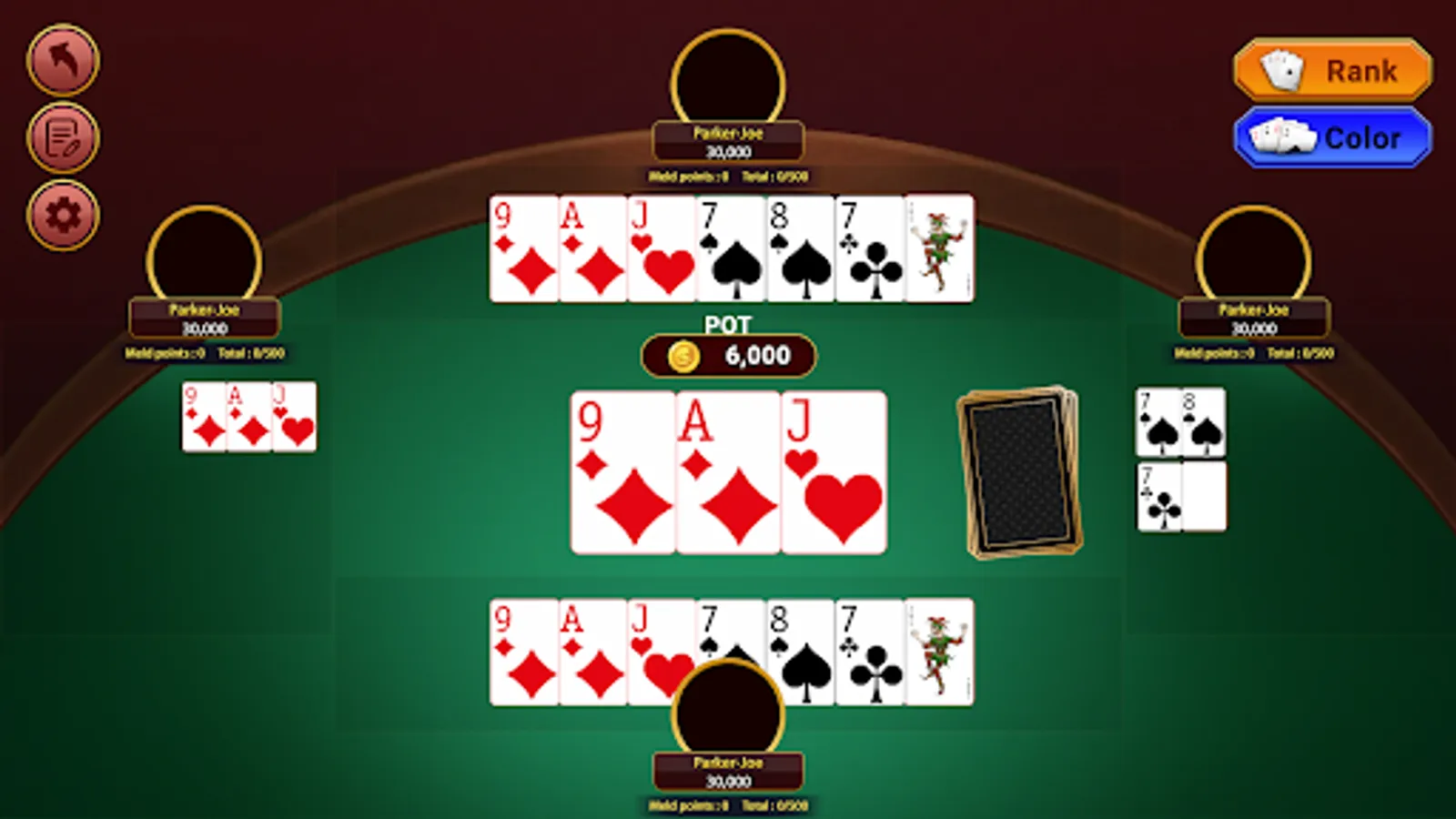 This is a version of rummy in which points are scored for cards melded and lost for unmelded cards remaining in a player's hand when someone goes out. The game is won by the first player to reach a cumulative score of 500 or more over a series of hands. In this game you are not restricted to taking only the top card of the discard pile - more than one card can be taken in order to reach a card lower down which you can use in a meld.