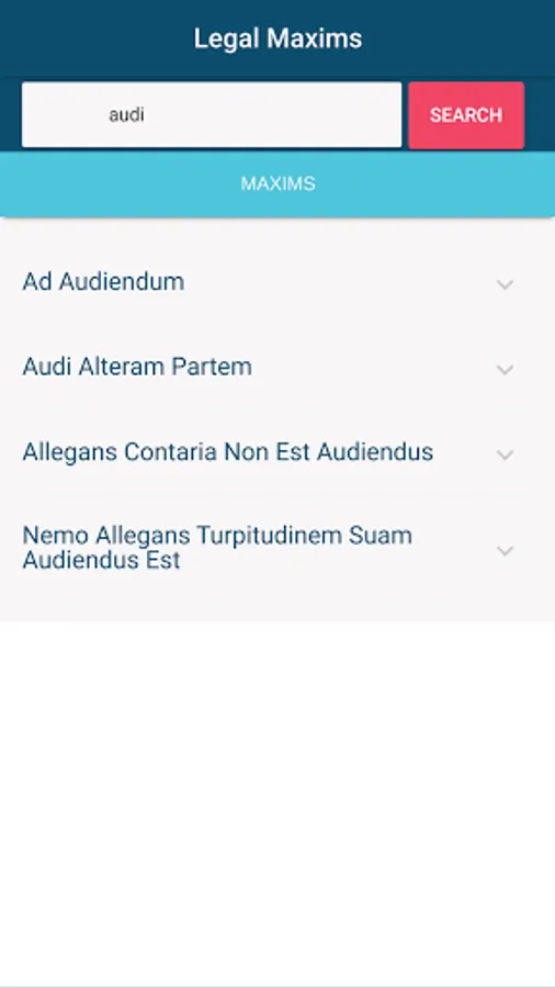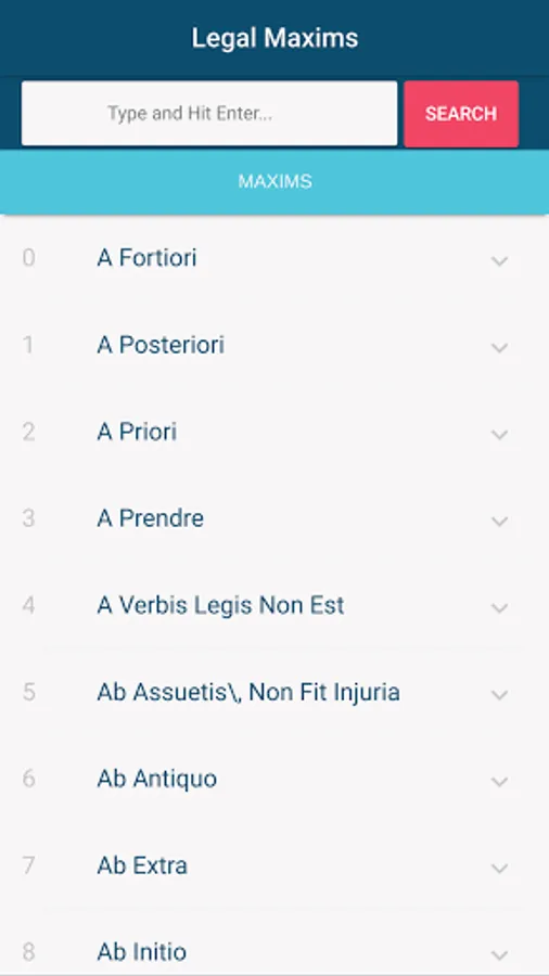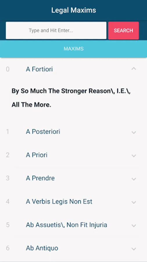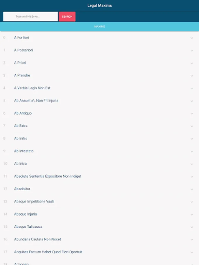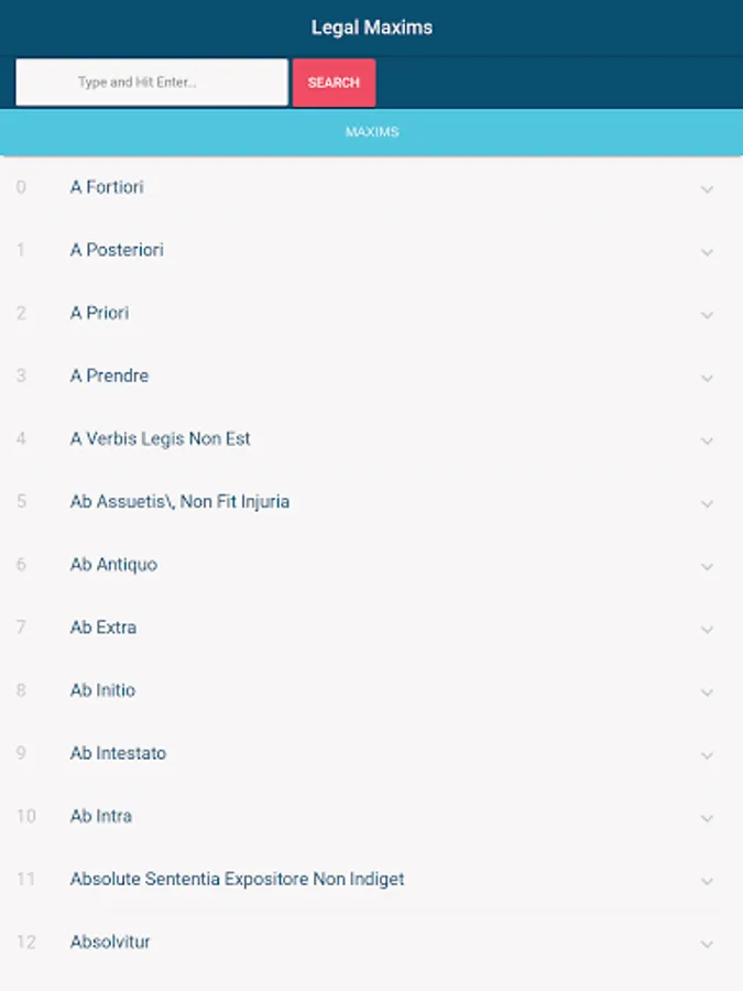 App includes all the maxims of law which exist along with famous legal terms of law which get spoken everyday by lawyers, judges, jurists and academics alike.