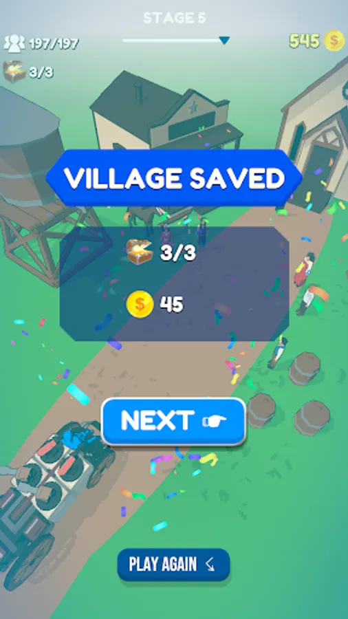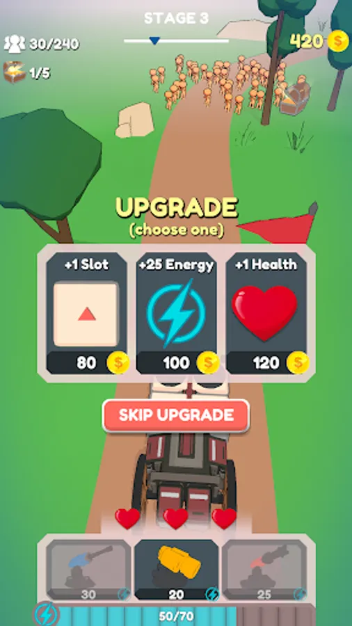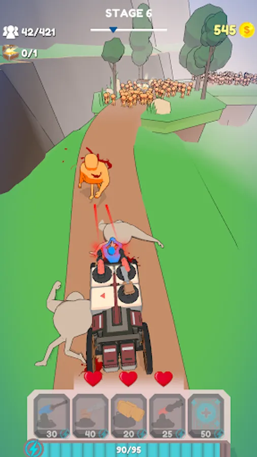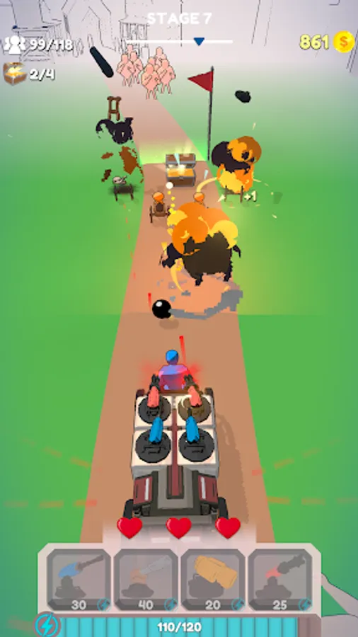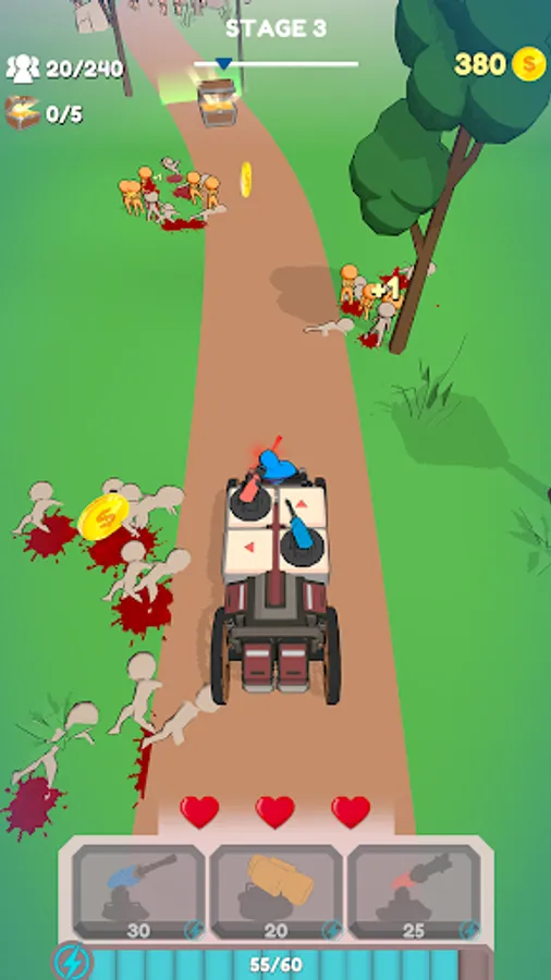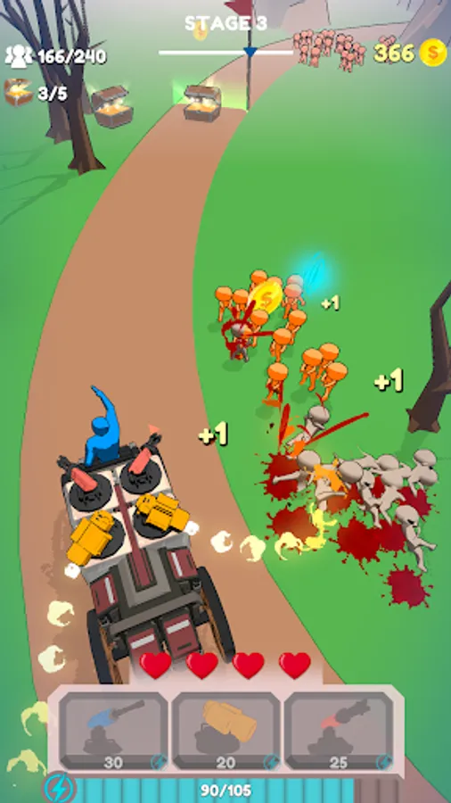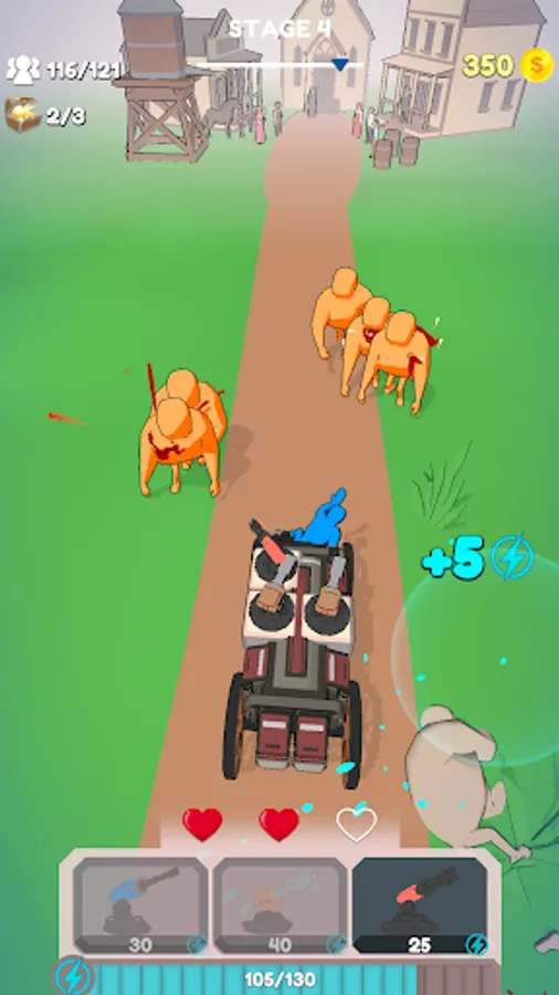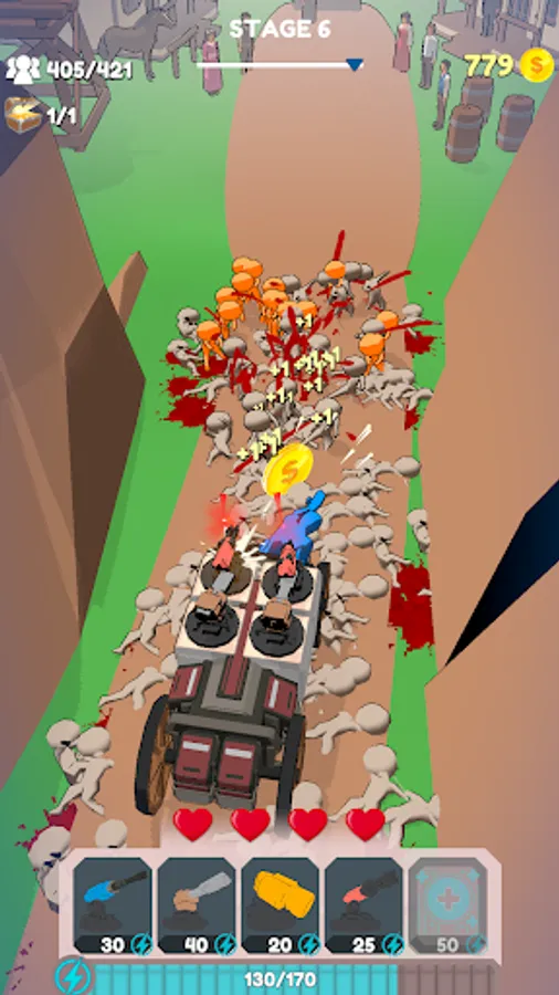 Add weapons on the wagon to defeat enemy waves and collect supplies to save the village, in this reverse tower defense where you attack the enemy hordes on the move!