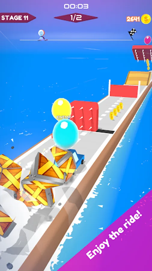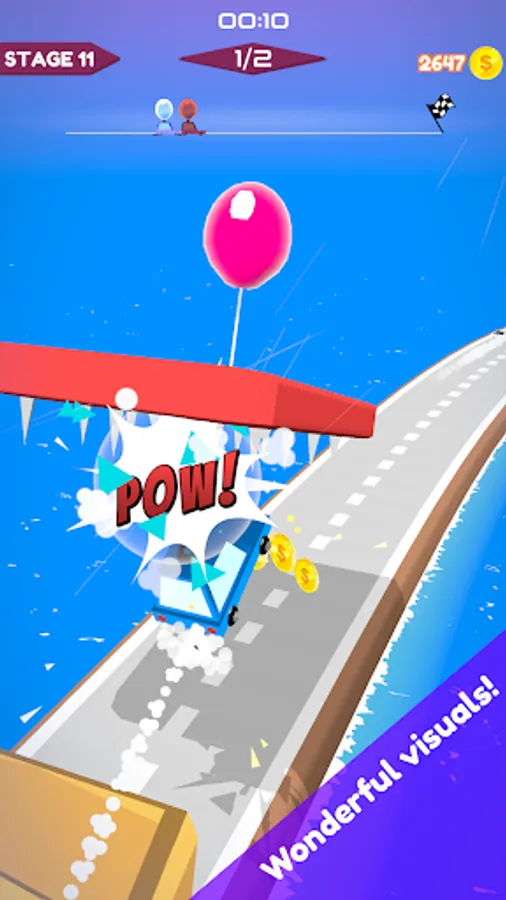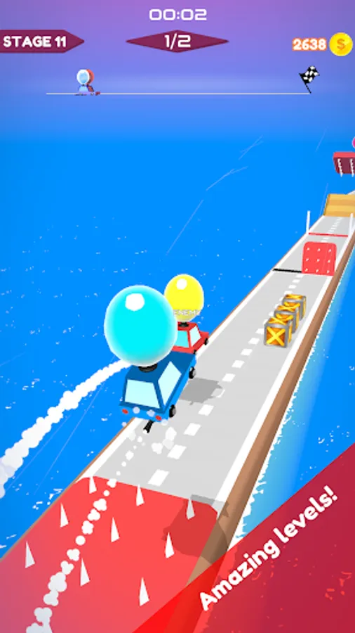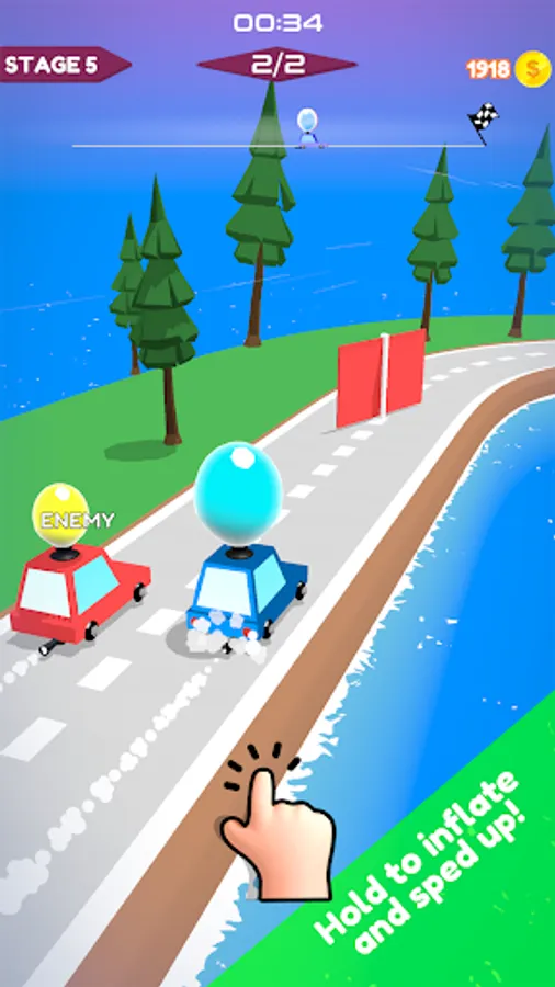 Control your car like this: Hold the finger to inflate your balloon and speed up. Release to deflate the balloon and slow down.