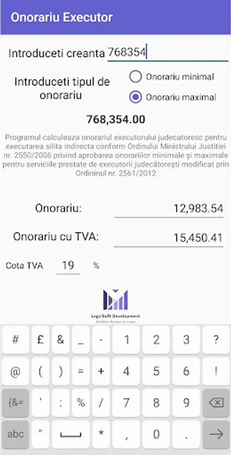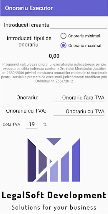 The application calculates the judicial executor's fee for the indirect forced execution according to the Order of the Minister of Justice no. 2550/2006 regarding the approval of the minimum and maximum fees for the services provided by the judicial executors modified by the Order of the Minister of Justice no. 2561/2012 for the modification of the annex to the Order of the Minister of Justice no. 2,550 / C / 2006 regarding the approval of the minimum and maximum fees for the services provided by the judicial executors