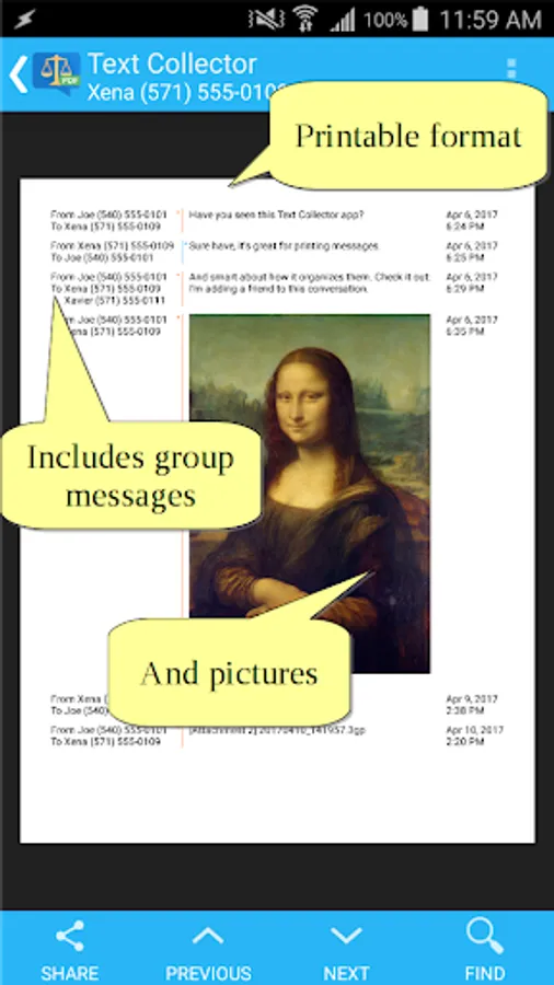 Use the printable text messages for ediscovery in your lawsuit or if you just like to print text messages. This can be used as an archive, but Text Collector is not a backup & restore program: it cannot transfer messages to a new phone.
