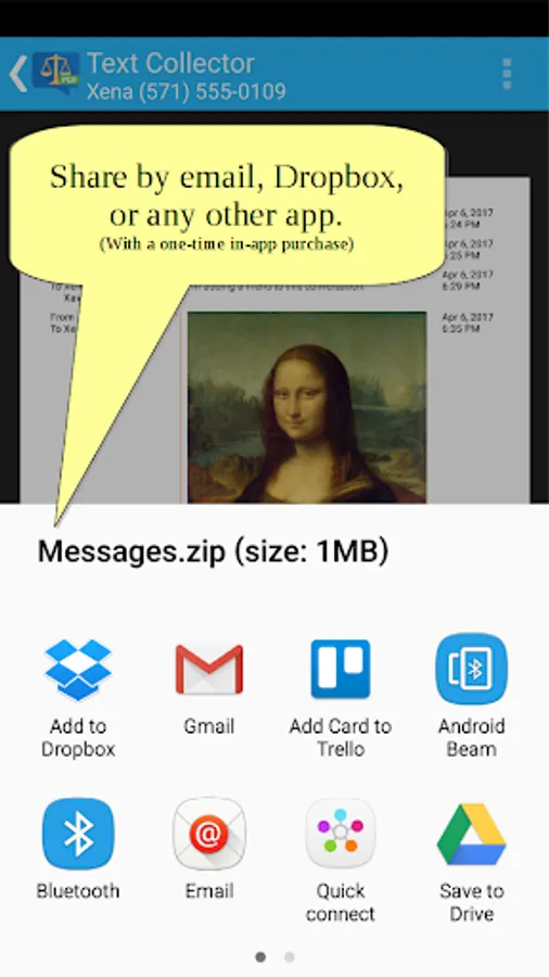 Export text messages as a zip file with one PDF per conversation and share them by email, Dropbox, or any other app.