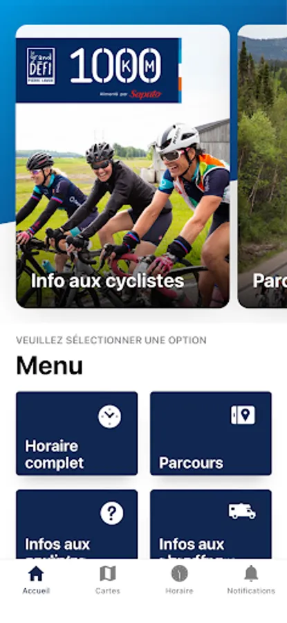 The Le 1000 km application allows you to obtain all the information on the Le 1000 km event of the Grand Défi Pierre Lavoie.