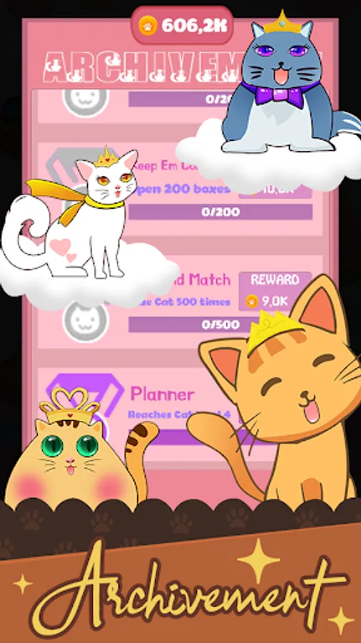 Discover and unlock many types of cats. Complete achievements and gain rewards. Watch your cat grow to a big tower which is filled with toys all over.