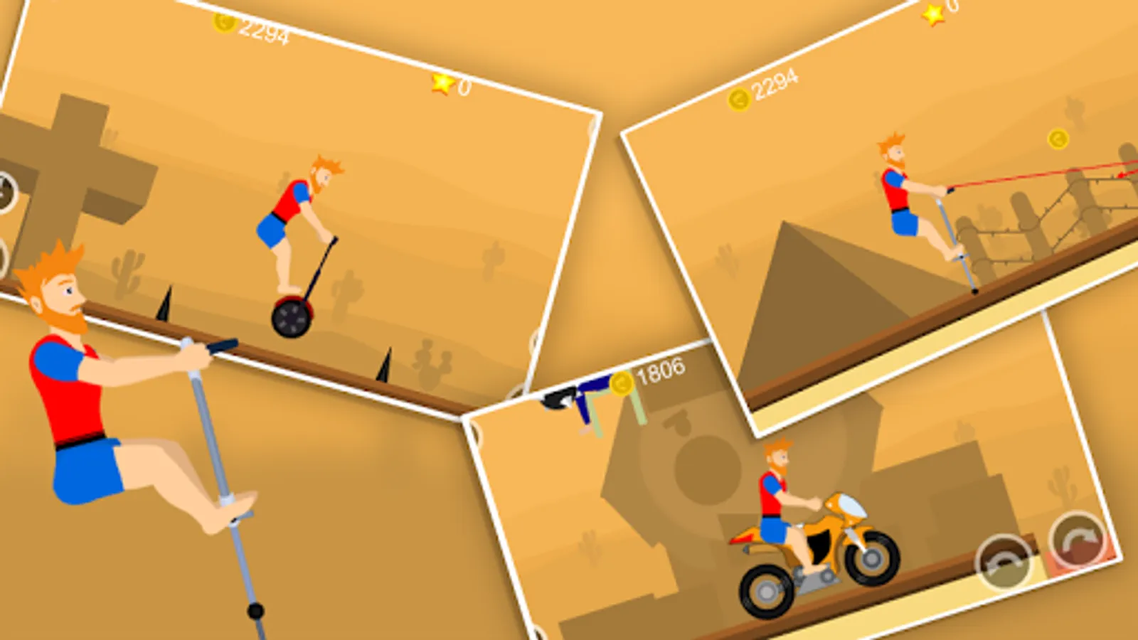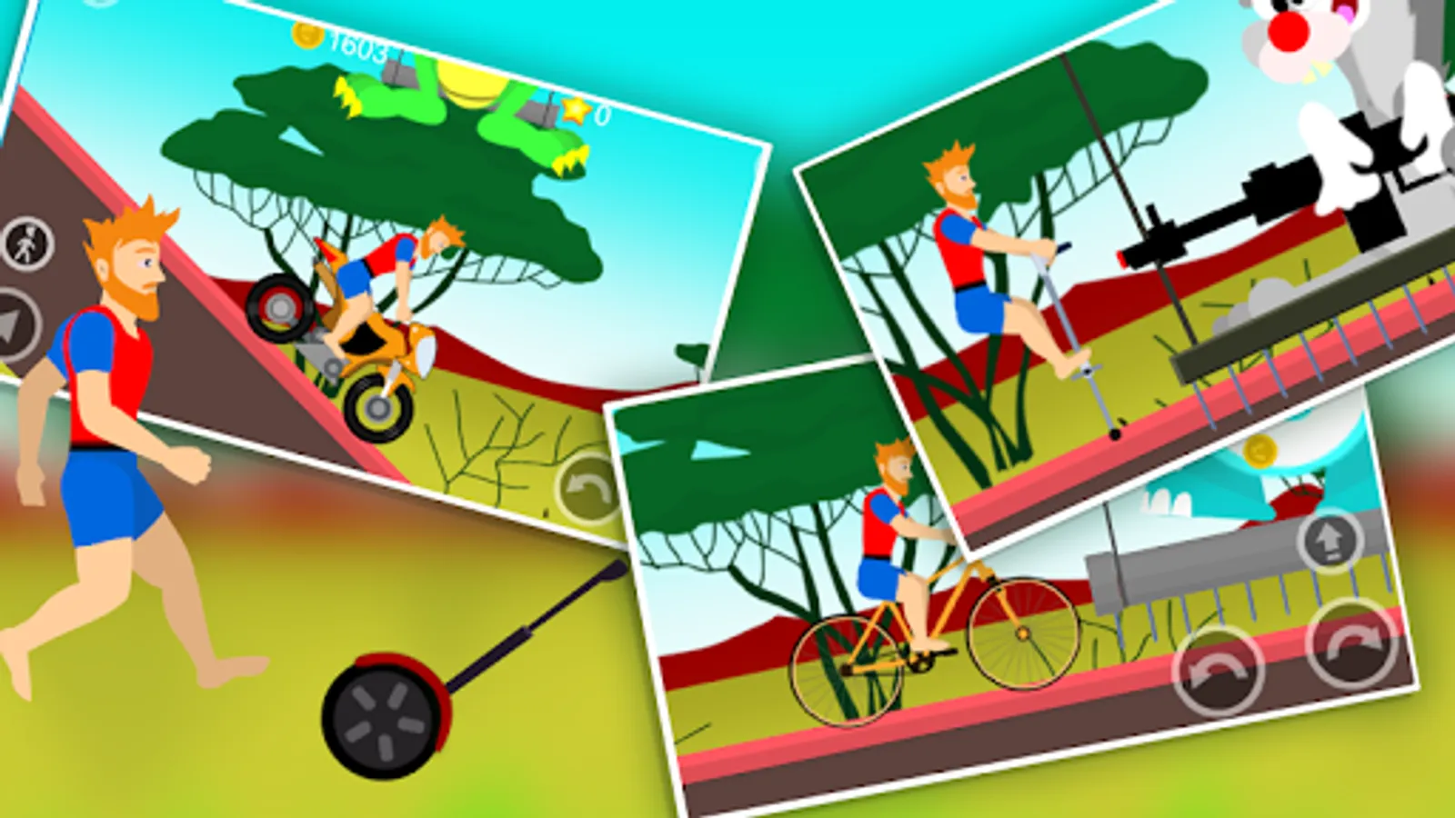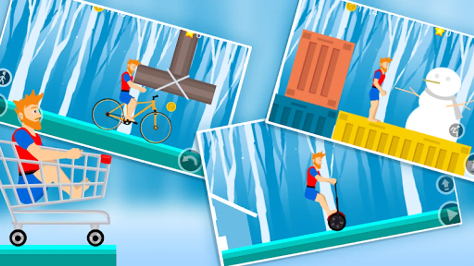 In Scary Wheels: Don't Rush, you will play as Effective Shopper on an shopping cart, Super Boy on a bicycle, Business Guy on a personal transporter, Super Hero on a rider car or as Bad Boy jump with pogo stick.
