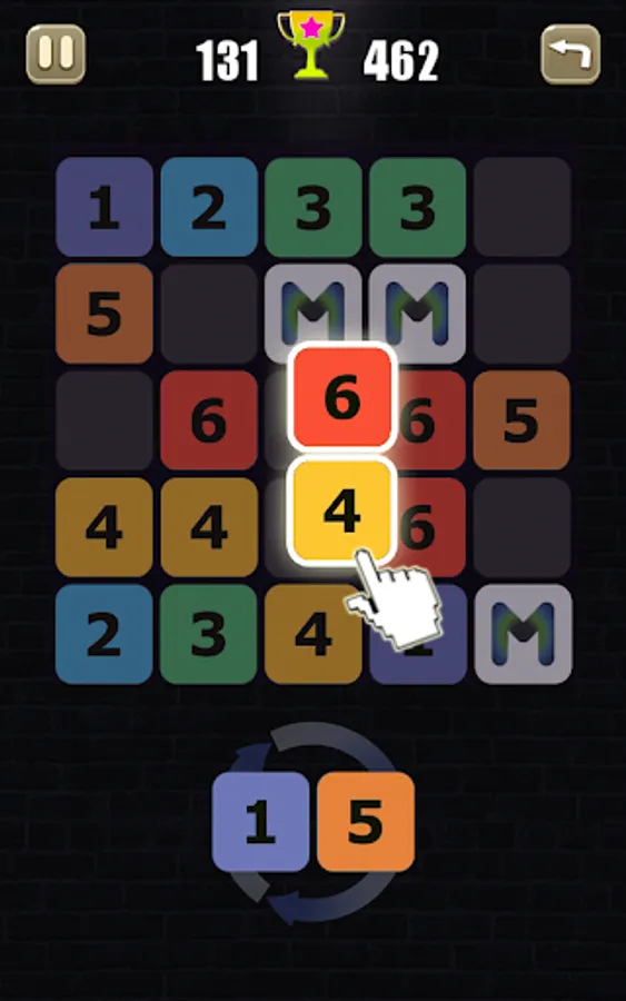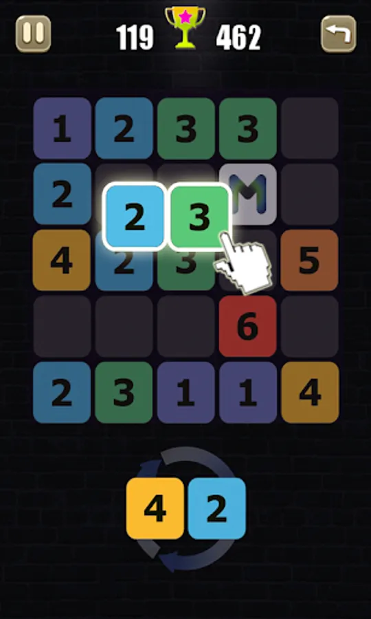 1. Place three blocks(or more) with the same number next to each other to merge them, horizontally, vertically, or both.