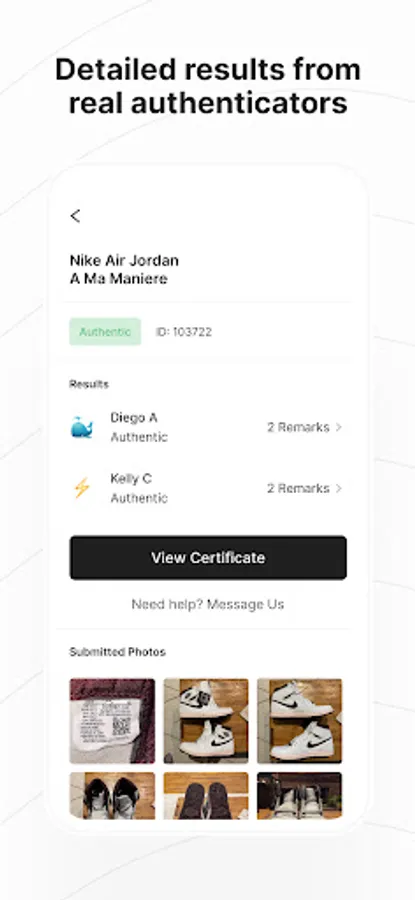 Each authentication is reviewed by 2 authenticators. The results are made available through a public Authentication Certificate link, which can be shared with anyone. The Legitmark Authentication Certificate serves as a credible, impartial source of verification for customers during disputes with banks and online marketplaces, providing evidence of authenticity for a fair outcome.