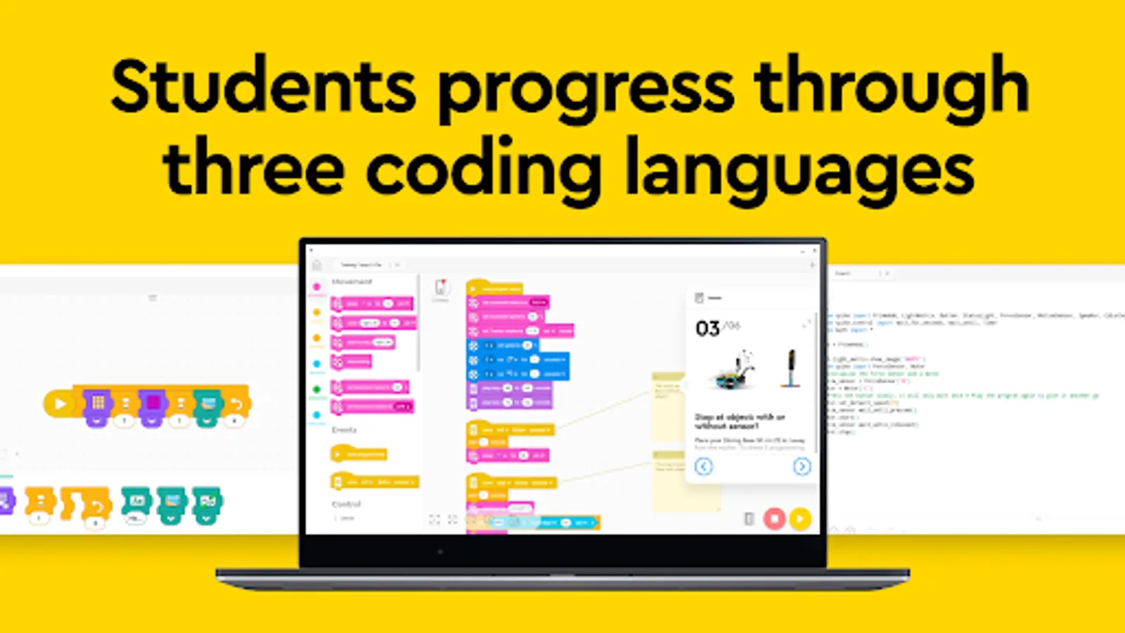 The SPIKE App provides multiple intuitive coding environments which, when combined with SPIKE Prime or SPIKE Essential, offer a naturally adaptive, physical, and digitally creative system that teachers and students alike love to use. Students first progress from using simple icon-blocks to word-block coding based on Scratch, and finally Python to code their creations and bring STEAM learning to life. The SPIKE App delivers exciting and playful learning experiences for students of all abilities.
