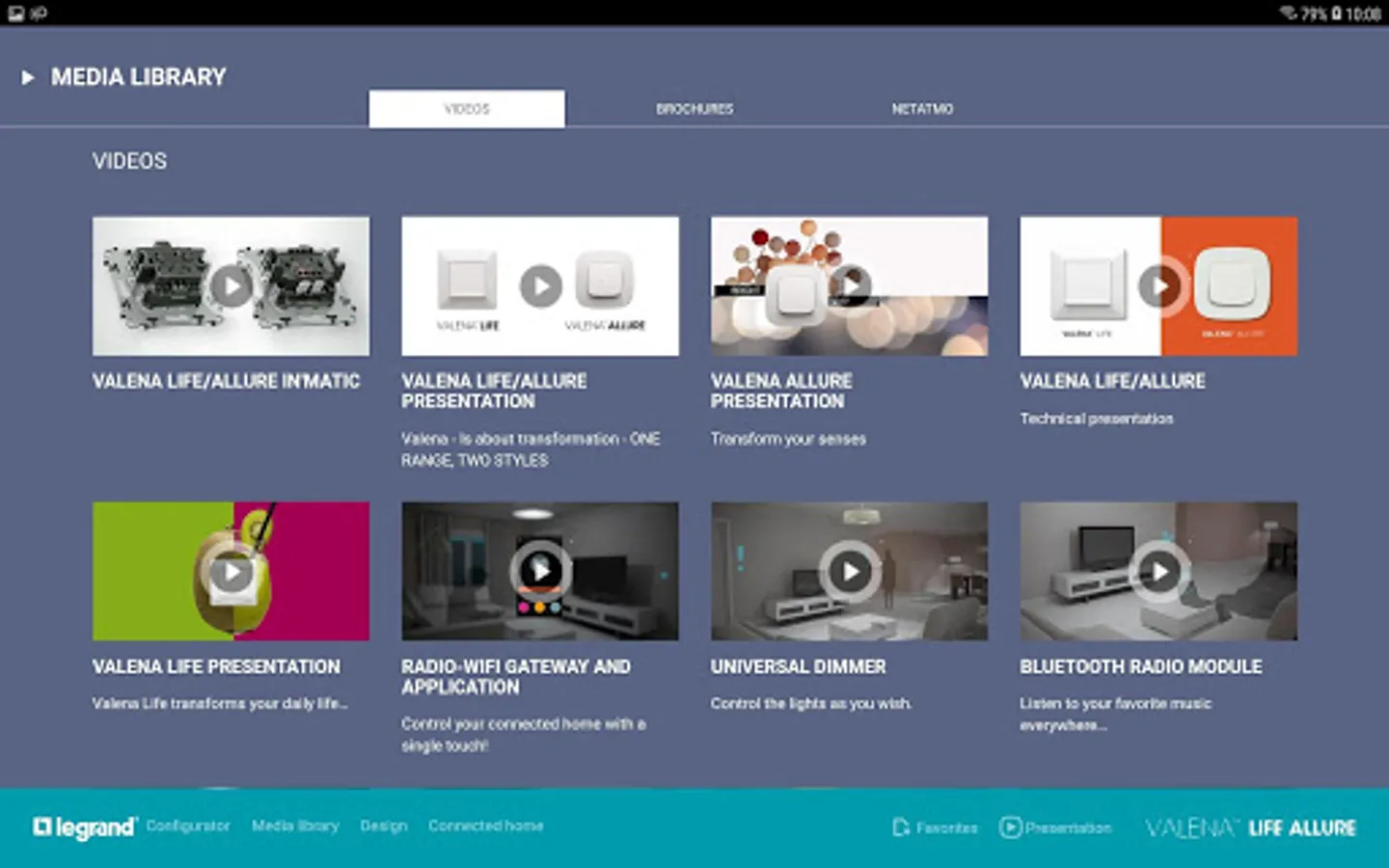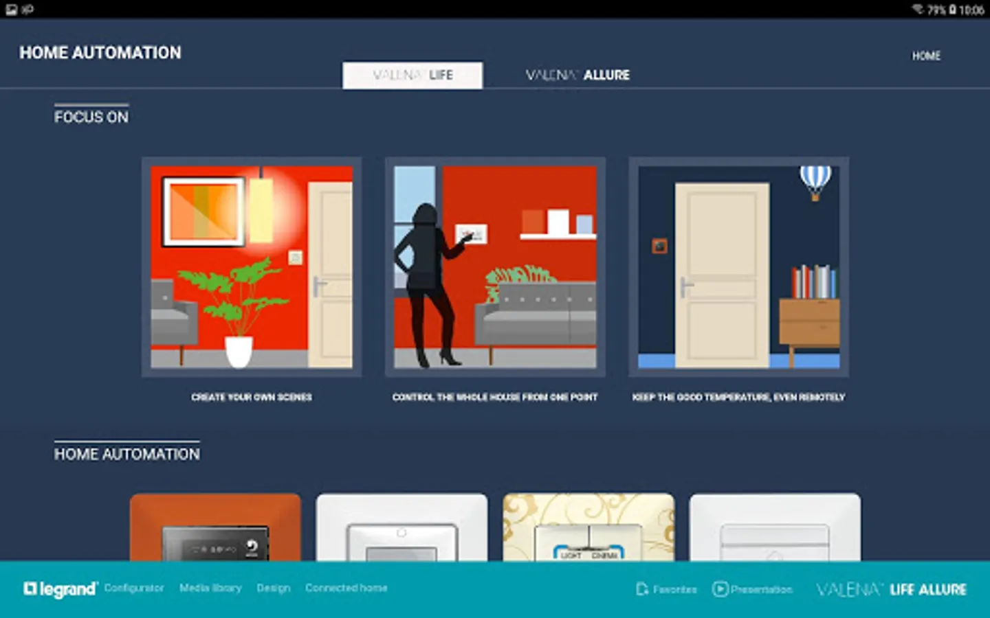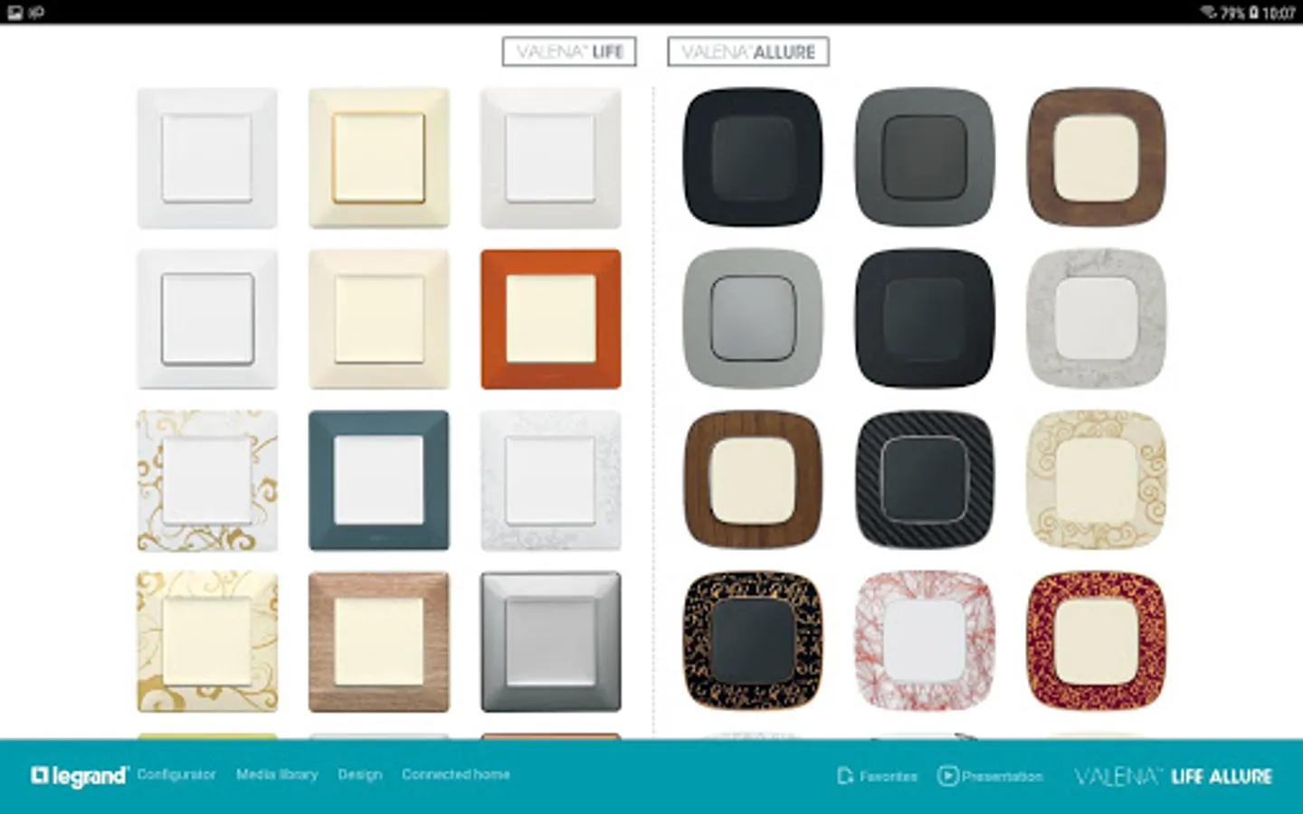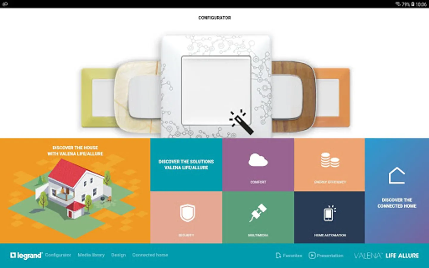In this app you can discover not only all the available functions of the range, but also all the proposed finishes. From the very neutral to modern, refined and exclusive finishes, Valena Life/Allure has certainly the best option for your interior. The app helps you to make the best choice for each room. Take a picture of your wall and test the most adapted finish for your wiring devices to sublimate your decoration.