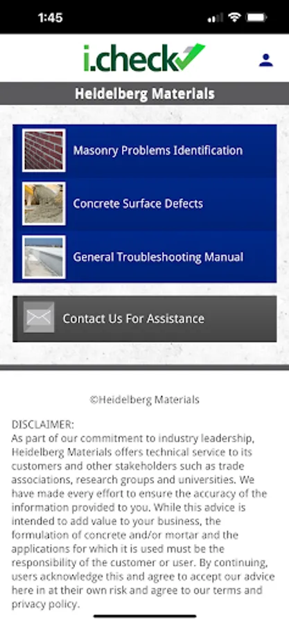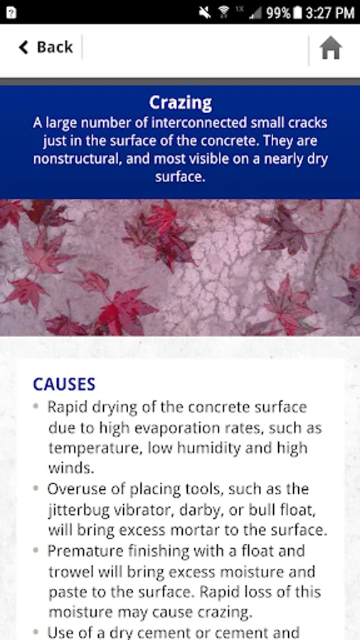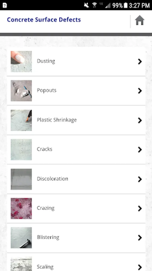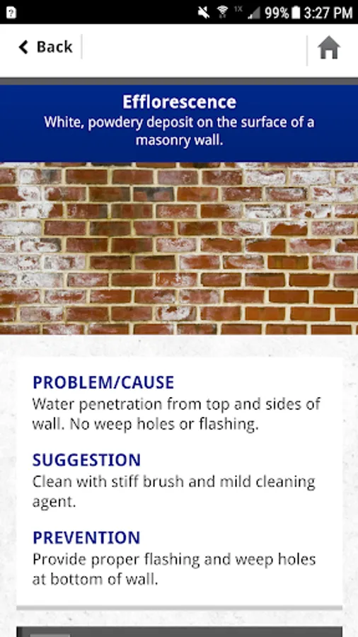 iCheck provides photos of common issues in concrete and masonry applications. Each photo is complemented with a listing of potential causes, and detailed corrective actions to alleviate the problem.