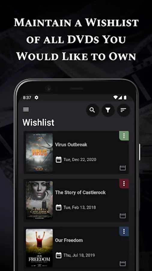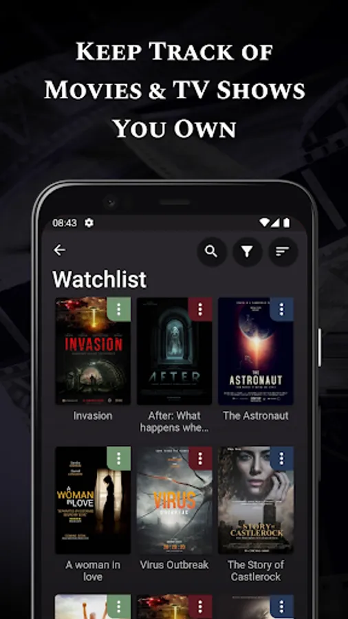 👍 Create a virtual shelf and add your movies or series so you can keep track of your collection seamlessly.👍 Maintain your movie library easily from different devices.