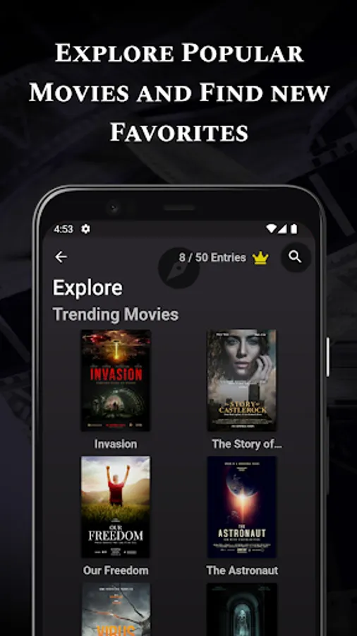For copyright reasons the Screenshots only show fictitious movies. Inside the app it is of course possible to find and add real movies and series. All film-related metadata used inside the app is supplied by The Movie Database (https://www.themoviedb.org/). While this app uses the TMDb API it is not endorsed or certified by TMDb.