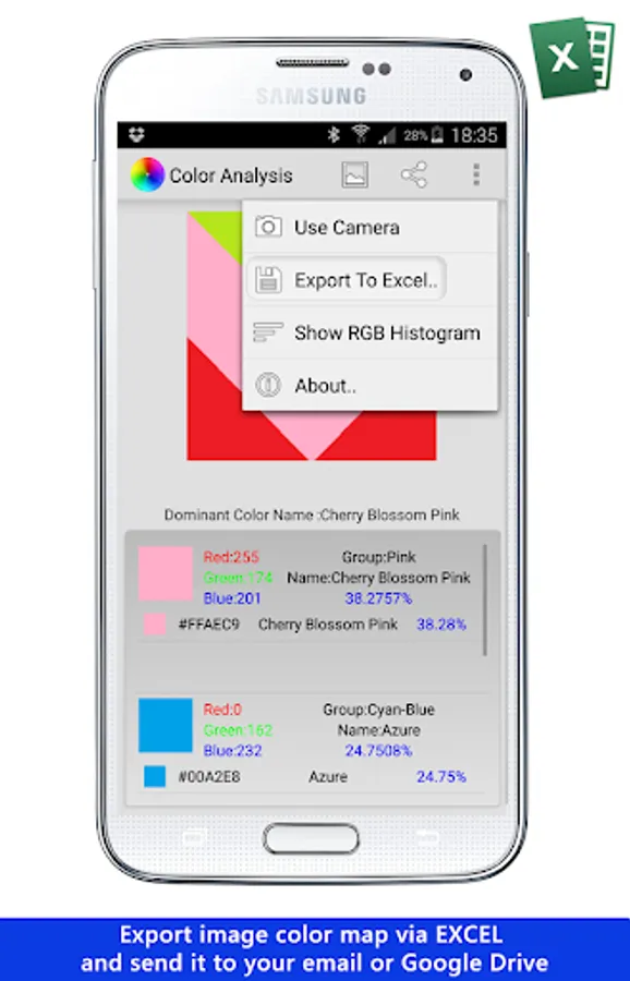 5. Export color analysis results to Excel file over the cloud (Dropbox,Drive) or local storage.