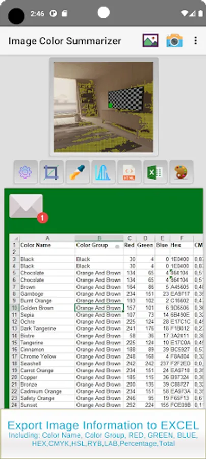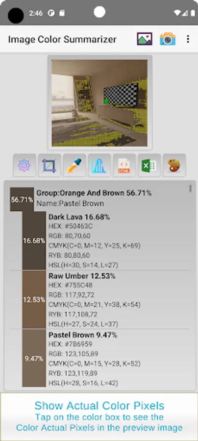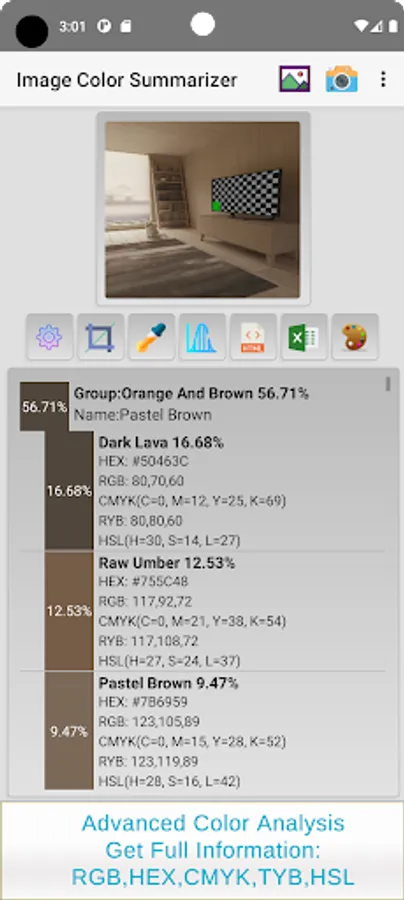 Image Color Summarizer extracts the colors from any image and gives you full statistics information such as color name, color percentage, RGB, HEX, RYB, CMYK, and HSL.