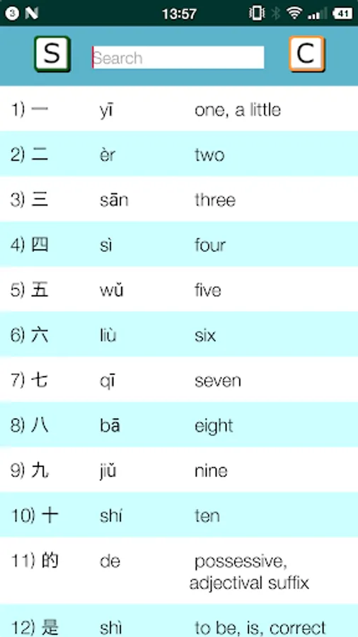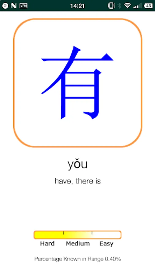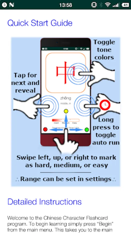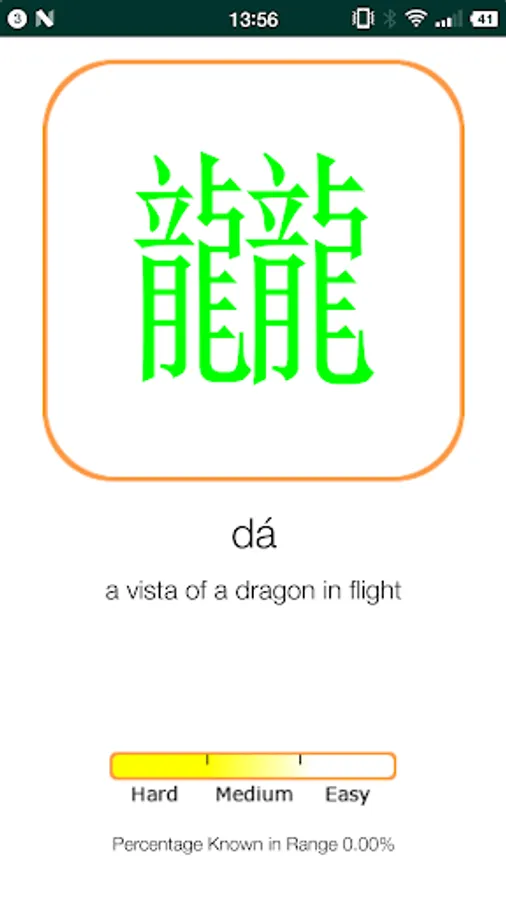 Recommended study habits: select a range from 50 to 70 characters and begin memorizing them with the tone colors on and in sequential order. This may be difficult at first but after rapid repetition your brain will start recognizing them. You should also notice certain parts of characters will be found on other characters and in many cases this will give a clue as to the pronunciation. You will begin learning faster as your brain begins to recognize patterns in the language. After becoming comfortable with the range start marking them as “easy” or “medium”, or “hard” (they should all already be marked hard the first time around). Then turn on random mode and that should help you finish memorizing the characters that were giving you problems. Once you have a really good grasp on the range try turning off the tone colors and see how well you can also recall the tones. Having successfully mastered a range, move on to the next one. I feel it is important to add that even though you may be able to recall a given range very well it is still beneficial to study it periodically as repetition will strengthen your recollection.