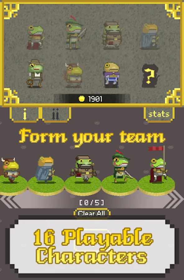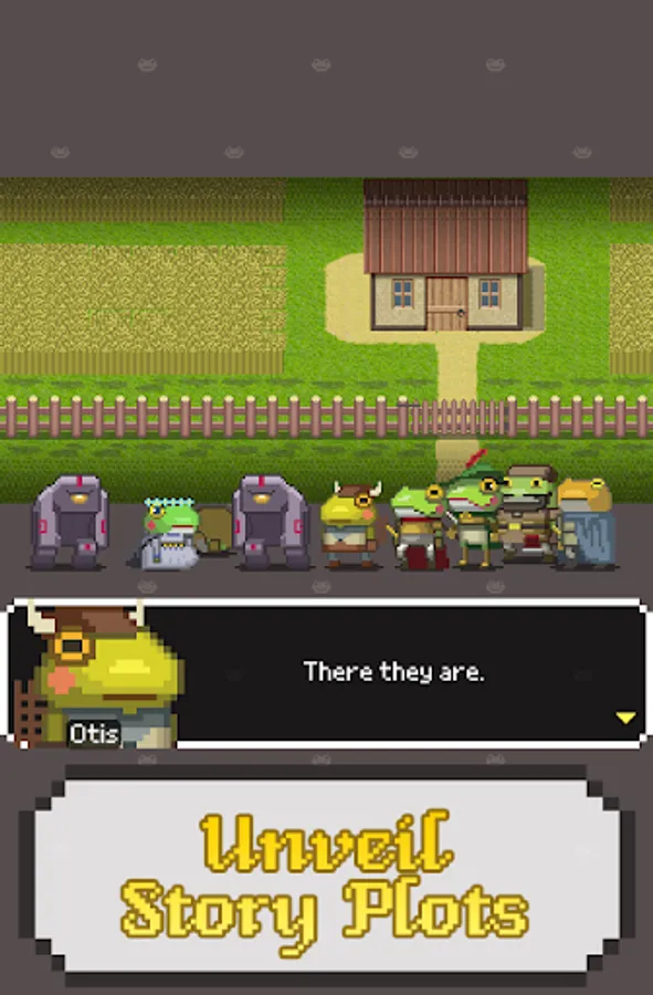 Form you own team with squire, swordsman, archer, wizard and knight, unite them under your flag. Lead your team to fight for glory, unveil secret conspiracy, explore dungeons and meet with other cool frog characters.