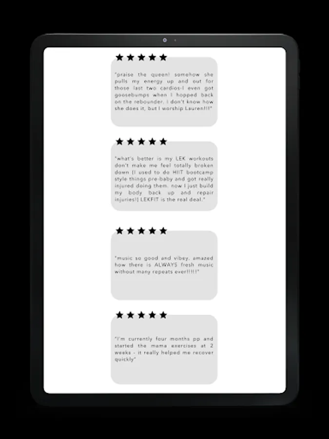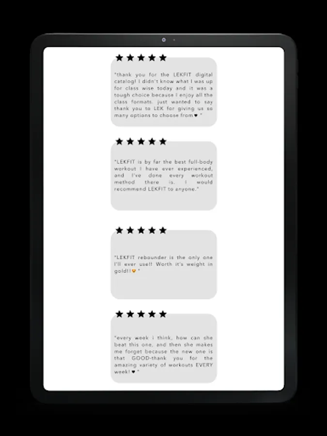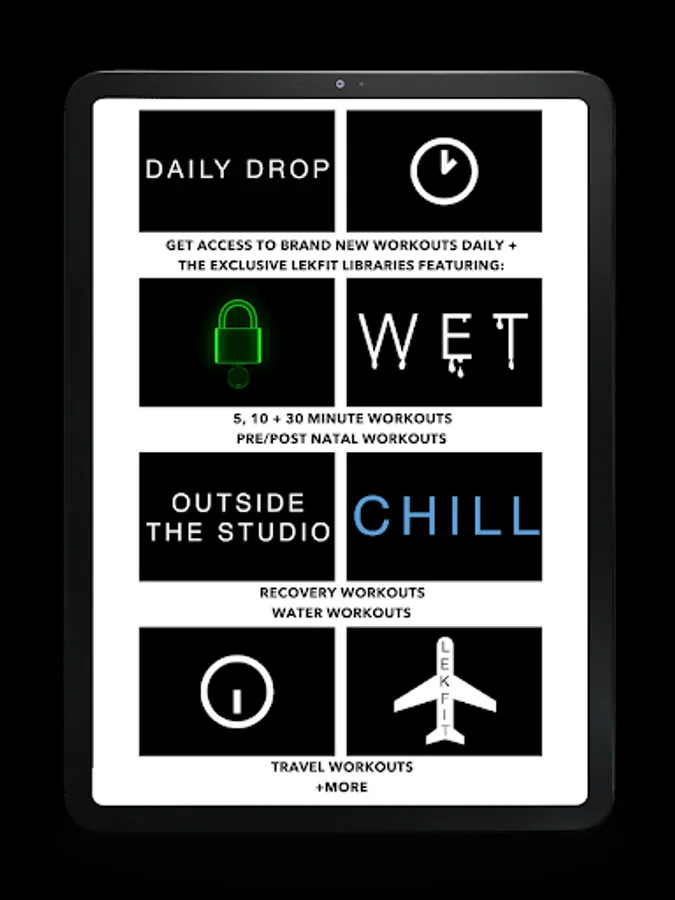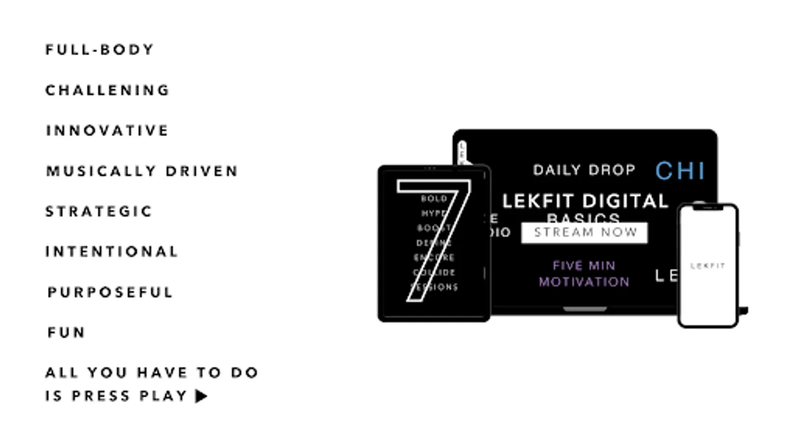 Welcome to LEKFIT digital! Named BEST in specialty fitness. Eliminate the boredom and bring on the fun, as we take the guesswork out of your fitness routine. NEW workouts released DAILY. All you have to do is press play!