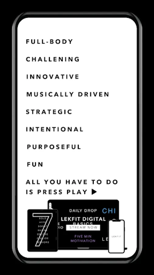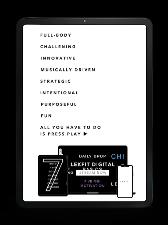 LEKFIT is a strategically curated fitness method that features dynamic movement designed to work the full body. With NEW daily workouts, LEKFIT contains intervals of low impact, high intensity, fat burning cardio with muscle sculpting techniques created to strengthen and tone. LEKFIT offers musically driven, RESULTS PROVEN, fun and challenging workouts creating a complete fitness experience. Bring the LEKFIT method to you anytime + anywhere with seven workouts, seven days a week.