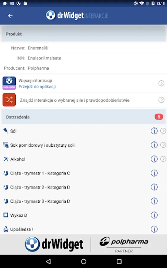 With the help of an application you can assess the strength and the likelihood of interaction. In addition, users can understand the special warnings concerning the use of specific products in pregnancy, in drivers and drugs from the group of I-N and psychotropic substances Group II-P, III-P, IV-P.