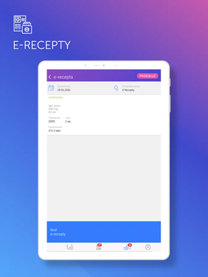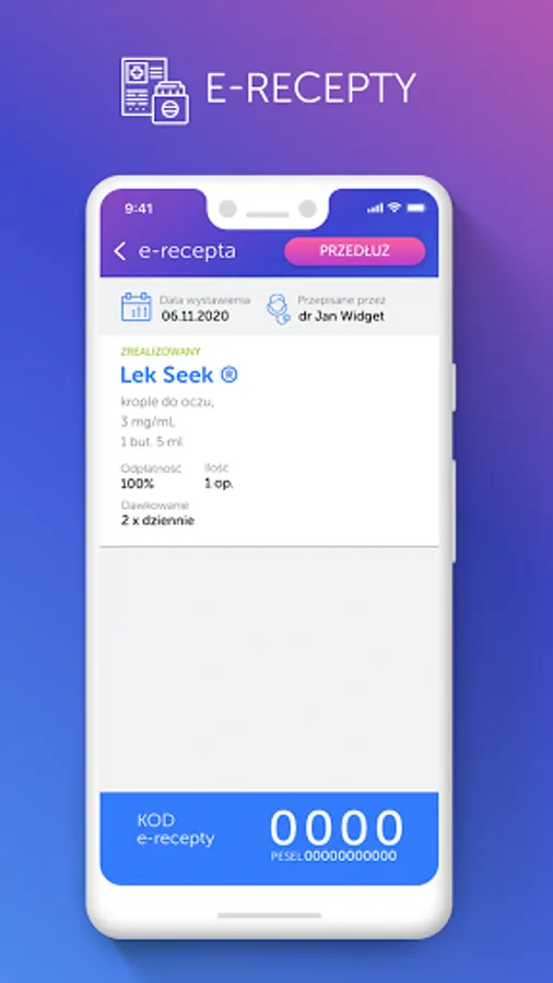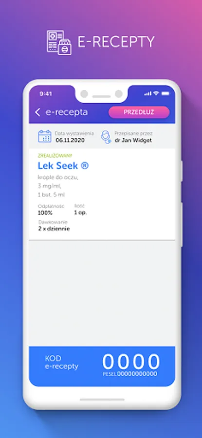 Extend e-prescriptions remotely. Send requests to extend the therapy with a given drug and wait for the doctor's reaction. If he issues a new e-prescription, the access code will appear in the app. If your request is rejected - you will receive a justification for the refusal.