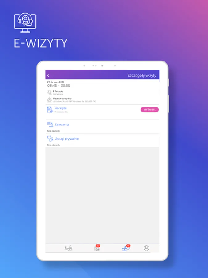 Always be up to date! MyDr will inform you about important events, such as issuing a new e-prescription or canceling an appointment. In the application you will also find the history of visits along with the doctor's recommendations.