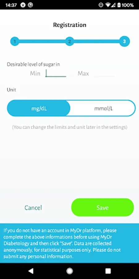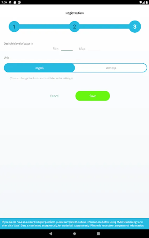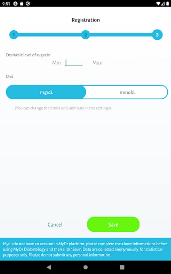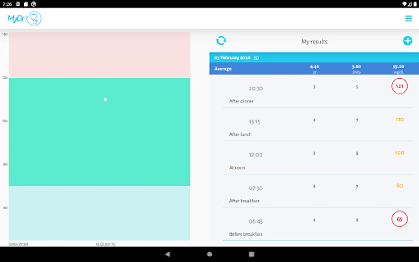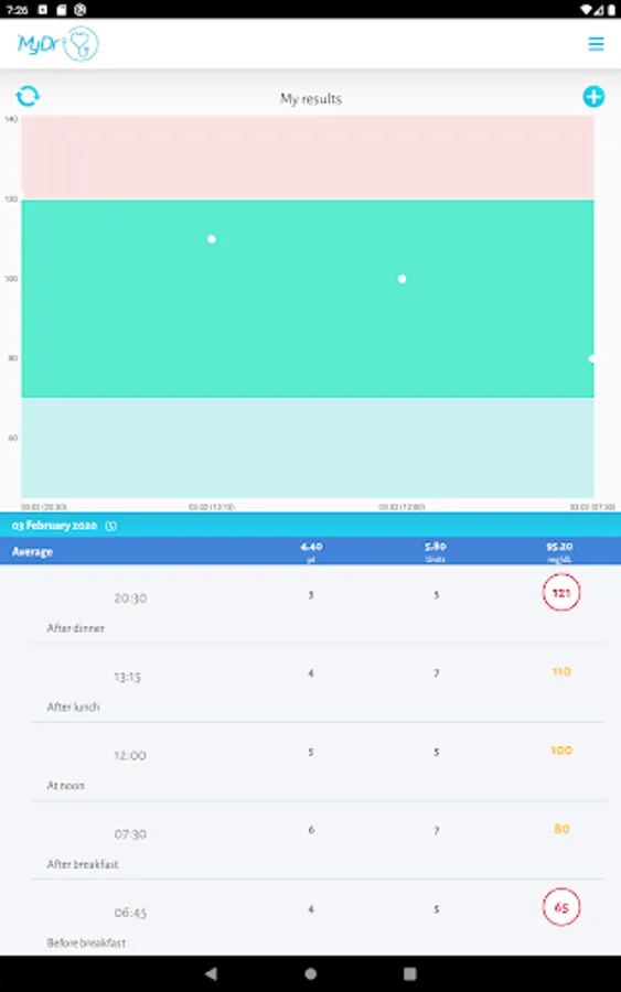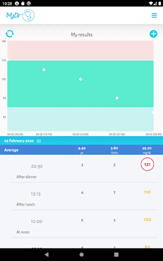 In addition, MyDr Diabetology allows you to set (and at any time edit) your own limits for the level of sugar considered to be correct. These limits are included in the graph showing the results of glucose measurements, thanks to which the user can quickly see if his results deviate from the threshold values.